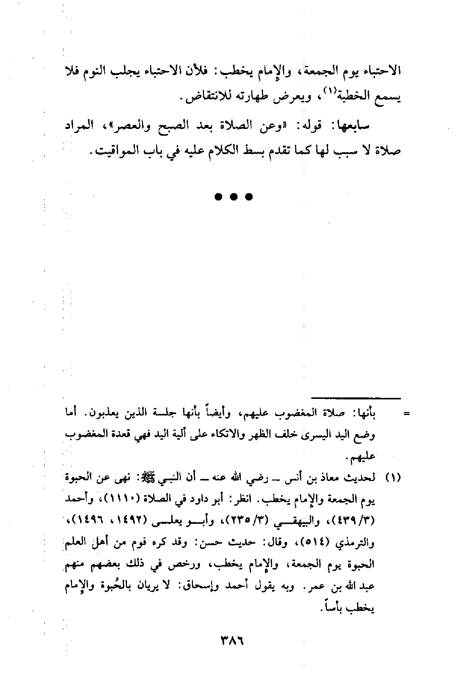 (¬1) لحديث معاذ بن أنس -رضي الله عنه- أن النبي - صلى الله عليه وسلم -: نهى عن الحبوة يوم الجمعة والإِمام يخطب. انظر: أبو داود في الصلاة (1110)، وأحمد (3/ 439)، والبيهقي (3/ 235)، وأبو يعلى (1492، 1496)، والترمذي (514)، وقال: حديث حسن: وقد كره قوم من أهل العلم الحبوة يوم الجمعة، والإِمام يخطب، ورخص في ذلك بعضهم منهم عبد الله بن عمر. وبه يقول أحمد وإسحاق: لا يريان بالحُبوة والإِمام يخطب بأساً.