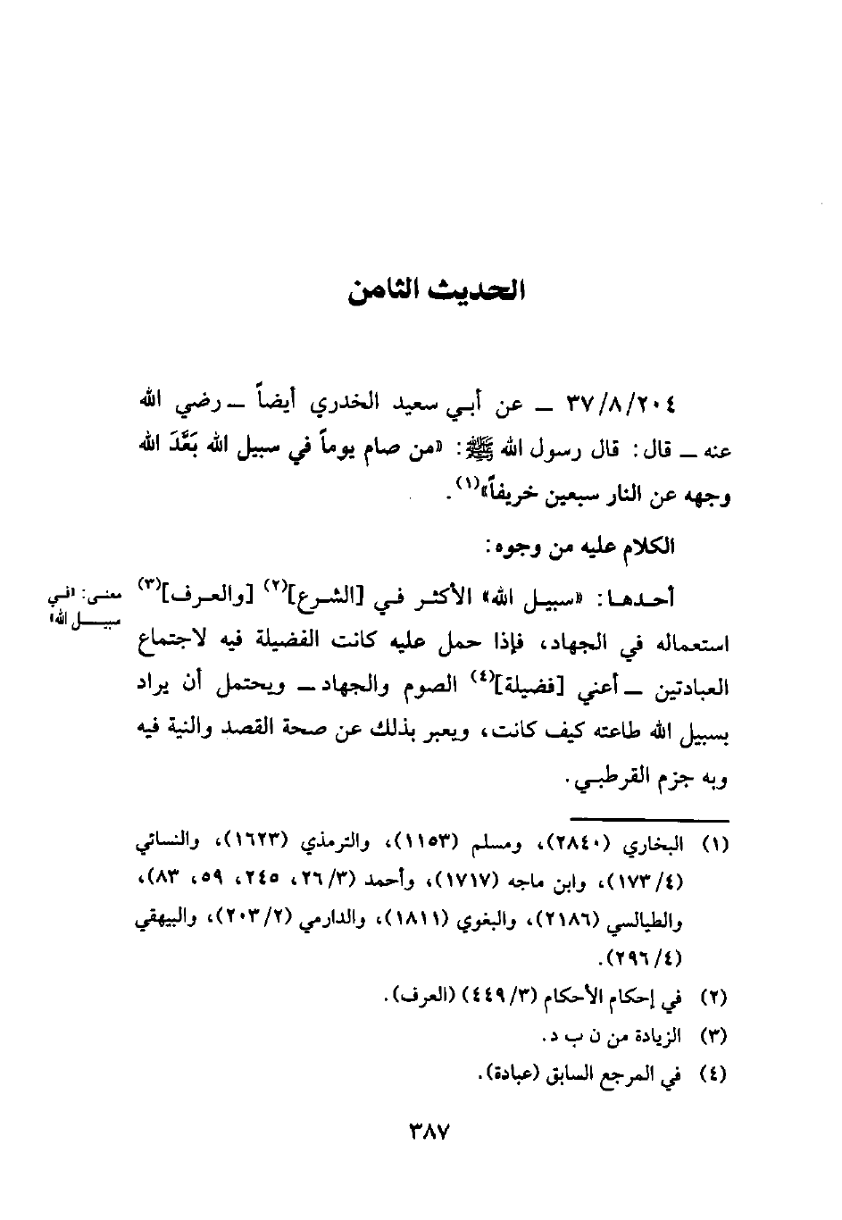 204/ 8/ 37 - عن أبي سعيد الخدري أيضاً -رضي الله عنه- قال: قال رسول الله - صلى الله عليه وسلم -: "من صام يوماً في سبيل الله بَعَّدَ الله وجهه عن النار سبعين خريفاً" (¬1).