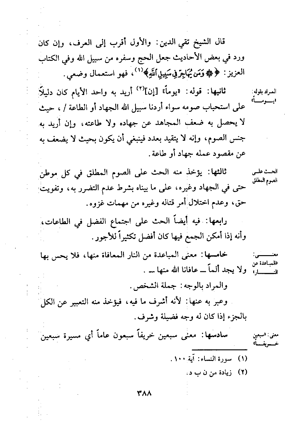 ثانيها: قوله: "يوماً" [إن] (¬2) أريد به واحد الأيام كان دليلاً على استحباب صومه سواء أردنا سبيل الله الجهاد أو الطاعة، حيث لا يحصل به ضعف المجاهد عن جهاده ولا طاعته، وإن أريد به جنس الصوم، وإنه لا يتقيد بعدد فينبغي أن يكون بحيث لا يضعف به عن مقصود عمله جهاد أو طاعة.