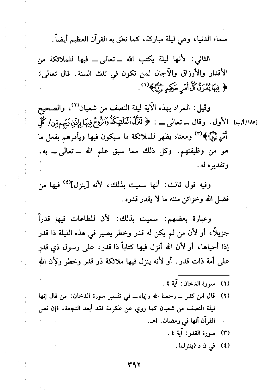 (¬2) قال ابن كثير -رحمنا الله وإياه- في تفسير سورة الدخان: من قال إنها ليلة النصف من شعبان كما روي عن عكرمة فقد أبعد النجعة، فإن نص القرآن أنها في رمضان. اهـ.