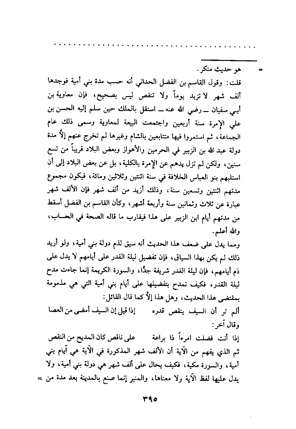ومما يدل على ضعف هذا الحديث أنه سيق لذم دولة بني أمية، ولو أريد ذلك لم يكن بهذا السياق، فإن تفضيل ليلة القدر على أيامهم لا يدل على ذم أيامهم، فإن ليلة القدر شريفة جدَّا، والسورة الكريمة إنما جاءت مدح ليلة القدر، فكيف تمدح بتفضيلها على أيام بني أمية التي هي مذمومة بمقتضى هذا الحديث، وهل هذا إلاَّ كما قال القائل: