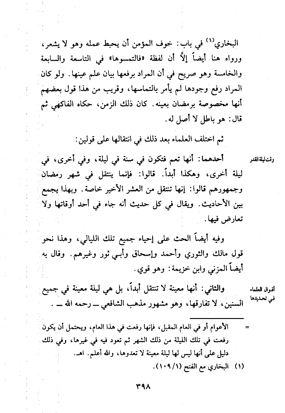 البخاري (¬1) في باب: خوف المؤمن أن يحبط عمله وهو لا يشعر، ورواه هنا أيضاً إلاَّ أن لفظة "فالتمسوها" في التاسعة والسابعة والخامسة وهو صريح في أن المراد برفعها بيان علم عينها. ولو كان المراد رفع وجودها لم يأمر بالتماسها، وقريب من هذا قول بعضهم أنها مخصوصة برمضان بعينه. كان ذلك الزمن، حكاه الفاكهي ثم قال: هو باطل لا أصل له.