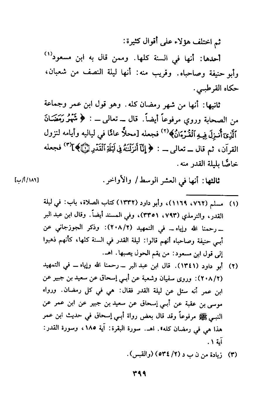 (¬2) أبو داود (1341). قال ابن عبد البر -رحمنا الله وإياه- في التمهيد (2/ 208): وروى سفيان وشعبة عن أبي إسحاق عن سعيد بن جبير عن ابن عمر أنه سئل عن ليلة القدر فقال: هي في كل رمضان. ورواه موسى بن عقبة عن أبي إسحاق عن سعيد بن جبير عن ابن عمر عن النبي - صلى الله عليه وسلم - مرفوعاً وقد قال بعض رواة أبي إسحاق في حديث ابن عمر هذا هي في رمضان كله". اهـ. سورة البقرة: آية 185، وسورة القدر: آية1.