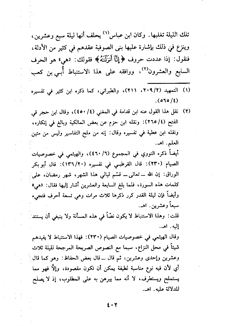 وقال الهيثمي في خصوصيات الصيام (230): فهذا الاستنباط لا يفيدهم شيئاً في محل النزاع، سيما مع النصوص الصريحة المرجحة لليلة ثلاث وعشرين وإحدى وعشرين، ثم قال -قال بعض الحفاظ: وهو كما قال أي لأن فيه نوع مناسبة لطيفة يمكن أن تكون مقصودة، وإلاَّ فهو مما يستملح ويستطرف، لا أنه مما يبرهن به على المطلوب، إذ لا يصلح للدلالة عليه. اهـ.