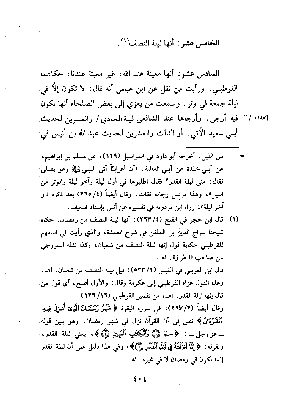 (¬1) قال ابن حجر في الفتح (4/ 263): أنها ليلة النصف من رمضان. حكاه شيخنا سراج الدين بن الملقن في شرح العمدة، والذي رأيت في المفهم للقرطبي حكاية قول إنها ليلة النصف من شعبان، وكذا نقله السروجي عن صاحب "الطراز". اهـ.