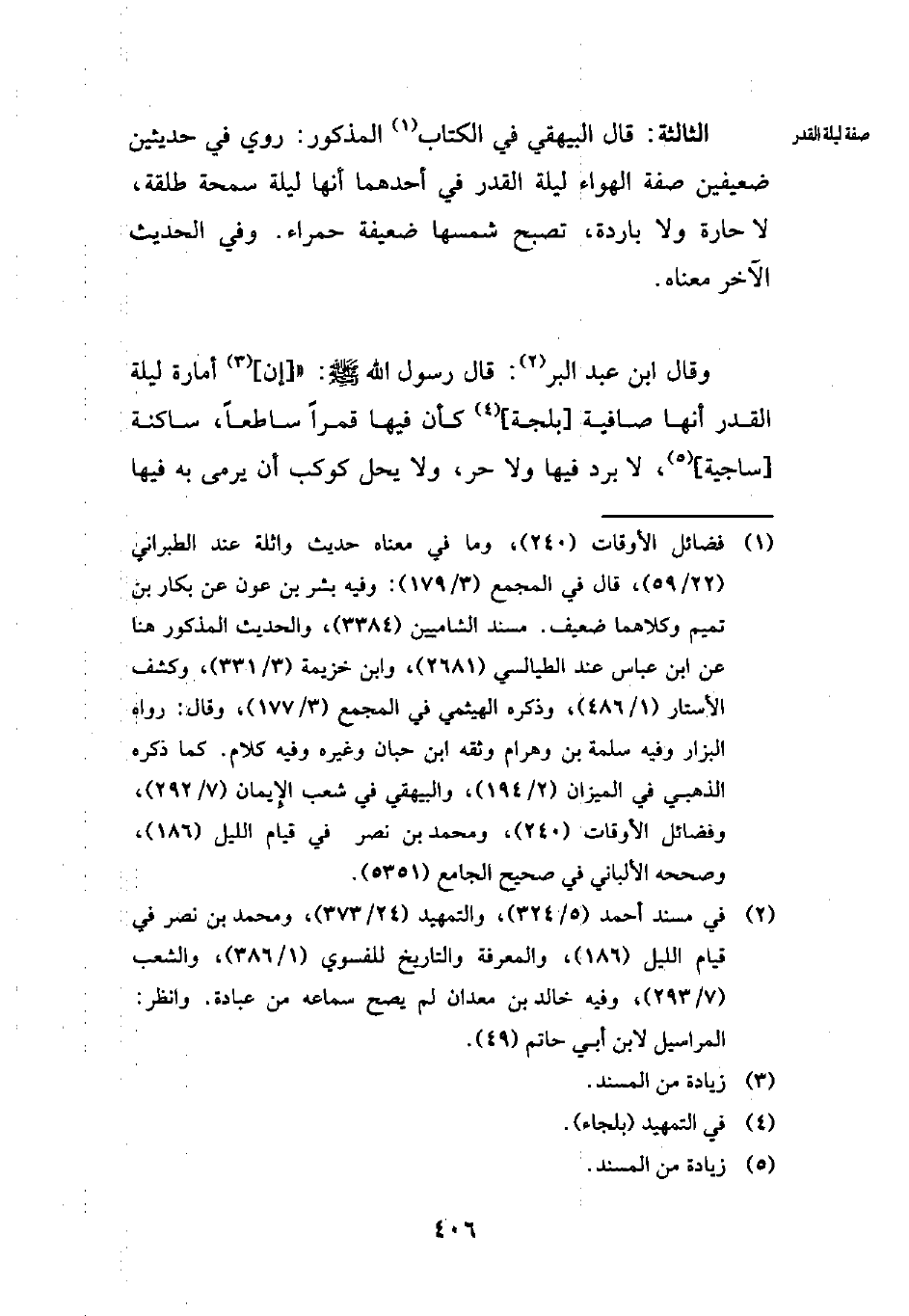 الثالثة: قال البيهقي في الكتاب (¬1) المذكور: روي في حديثين ضعيفين صفة الهواء ليلة القدر في أحدهما أنها ليلة سمحة طلقة، لا حارة ولا باردة، تصبح شمسها ضعيفة حمراء. وفي الحديث الآخر معناه.