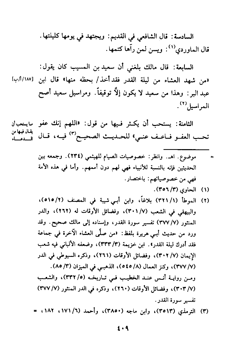 السابعة: قال مالك بلغني أن سعيد بن المسيب كان يقول: "من شهد العشاء من ليلة القدر فقد أخذ بحظه منها" قال ابن عبد البر: وهذا من سعيد لا يكون إلاَّ توقيفاً. ومراسيل سعيد أصح المراسيل (¬2).