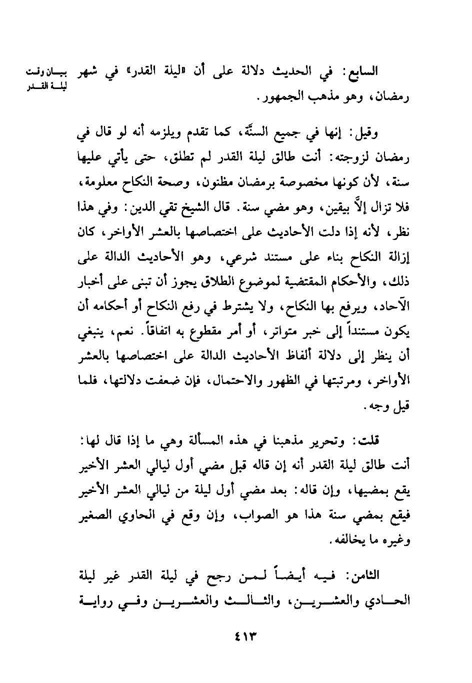 وقيل: إنها في جميع السنَّة، كما تقدم ويلزمه أنه لو قال في رمضان لزوجته: أنت طالق ليلة القدر لم تطلق، حتى يأتي عليها سنة، لأن كونها مخصوصة برمضان مظنون، وصحة النكاح معلومة، فلا تزال إلاَّ بيقين، وهو مضي سنة. قال الشيخ تقي الدين: وفي هذا نظر، لأنه إذا دلت الأحاديث على اختصاصها بالعشر الأواخر، كان إزالة النكاح بناء على مستند شرعي، وهو الأحاديث الدالة على ذلك، والأحكام المقتضية لموضوع الطلاق يجوز أن تبنى على أخبار الآحاد، ويرفع بها النكاح، ولا يشترط في رفع النكاح أو أحكامه أن يكون مستنداً إلى خبر متواتر، أو أمر مقطوع به اتفاقاً. نعم، ينبغي أن ينظر إلى دلالة ألفاظ الأحاديث الدالة على اختصاصها بالعشر الأواخر، ومرتبتها في الظهور والاحتمال، فإن ضعفت دلالتها، فلما قيل وجه.