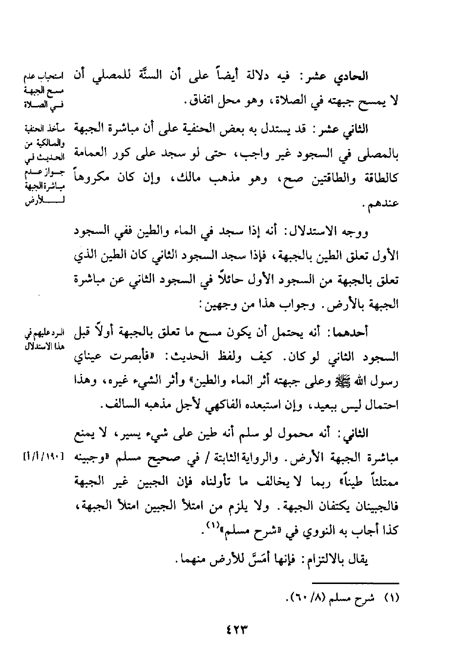 الثاني: أنه محمول لو سلم أنه طين على شيء يسير، لا يمنع مباشرة الجبهة الأرض. والرواية الثابتة في صحيح مسلم "وجبينه ممتلئاً طيناً" ربما لا يخالف ما تأولناه فإن الجبين غير الجبهة فالجبينان يكتفان الجبهة. ولا يلزم من امتلأ الجبين امتلأ الجبهة، كذا أجاب به النووي في "شرح مسلم" (¬1).