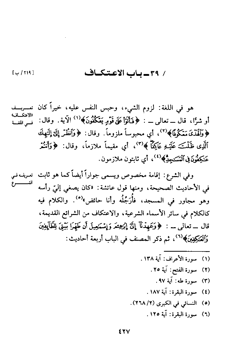 هو في اللغة: لزوم الشيء، وحبس النفس عليه، خيراً كان أو شرًّا، قال -تعالى-: {فَأَتَوْا عَلَى قَوْمٍ يَعْكُفُونَ} (¬1) الآية. وقال: {وَالْهَدْيَ مَعْكُوفًا} (¬2)، أي محبوساً ملزوماً. وقال: {وَانْظُرْ إِلَى إِلَهِكَ الَّذِي ظَلْتَ عَلَيْهِ عَاكِفًا} (¬3)، أي مقيماً ملازماً، وقال: {وَأَنْتُمْ عَاكِفُونَ فِي الْمَسَاجِدِ} (¬4)، أي ثابتون ملازمون.