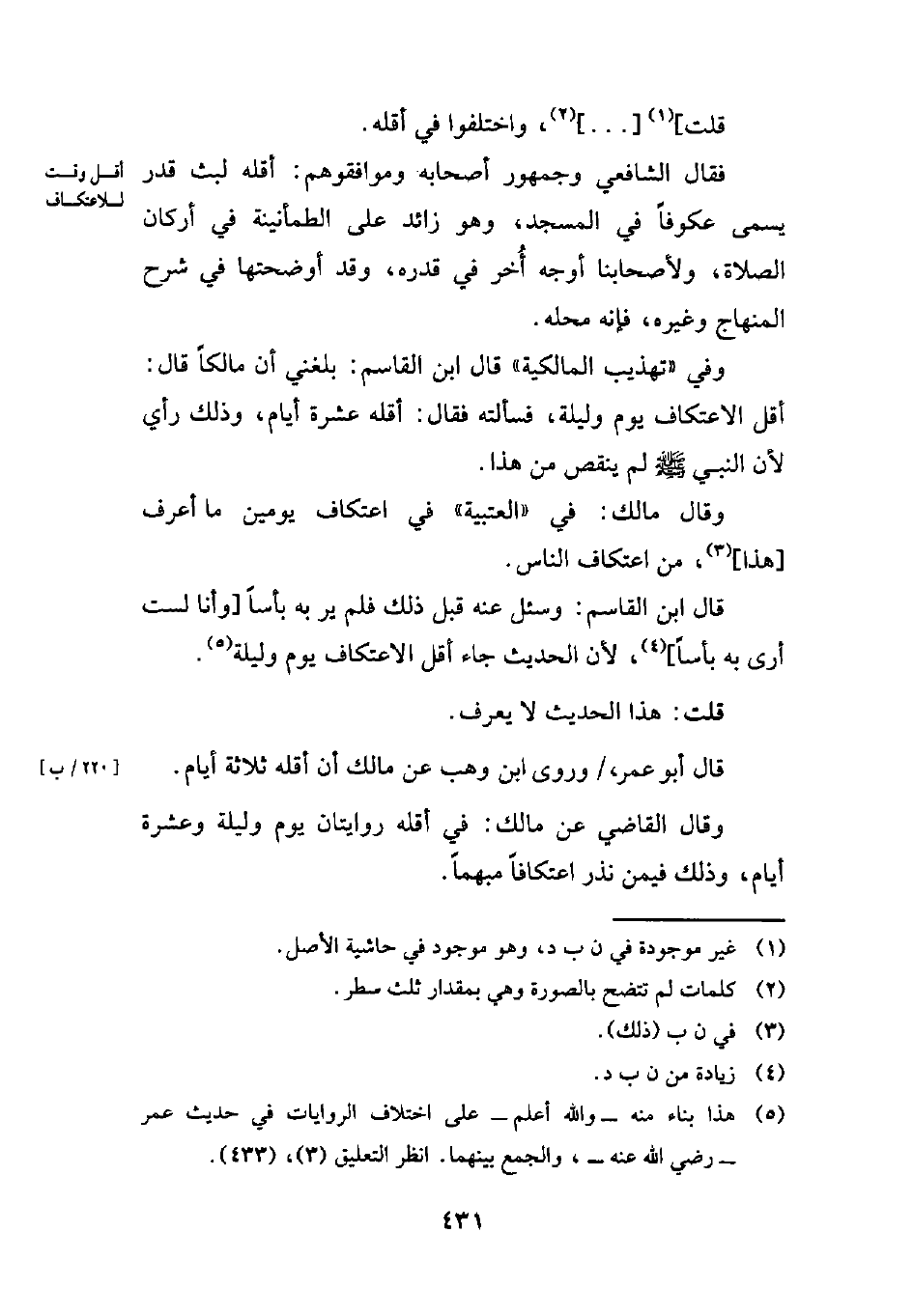 قال ابن القاسم: وسئل عنه قبل ذلك فلم ير به بأساً [وأنا لست أرى به بأساً] (¬4)، لأن الحديث جاء أقل الاعتكاف يوم وليلة (¬5).