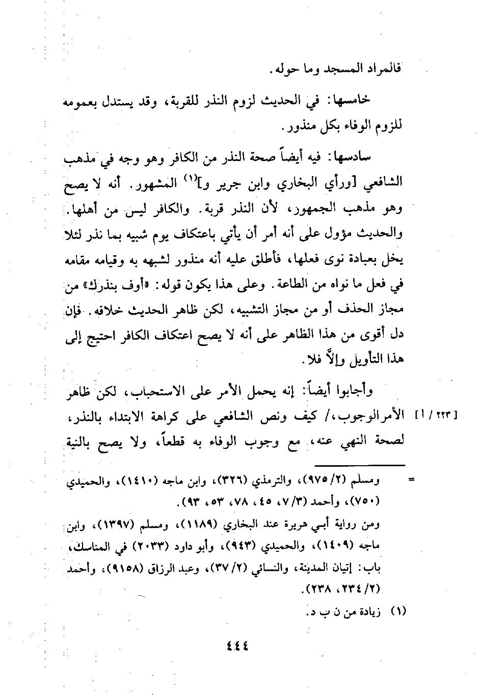 وأجابوا أيضاً: إنه يحمل الأمر على الاستحباب، لكن ظاهر الأمر الوجوب، كيف ونص الشافعي على كراهة الابتداء بالنذر، لصحة النهي عنه، مع وجوب الوفاء به قطعاً، ولا يصح بالنية