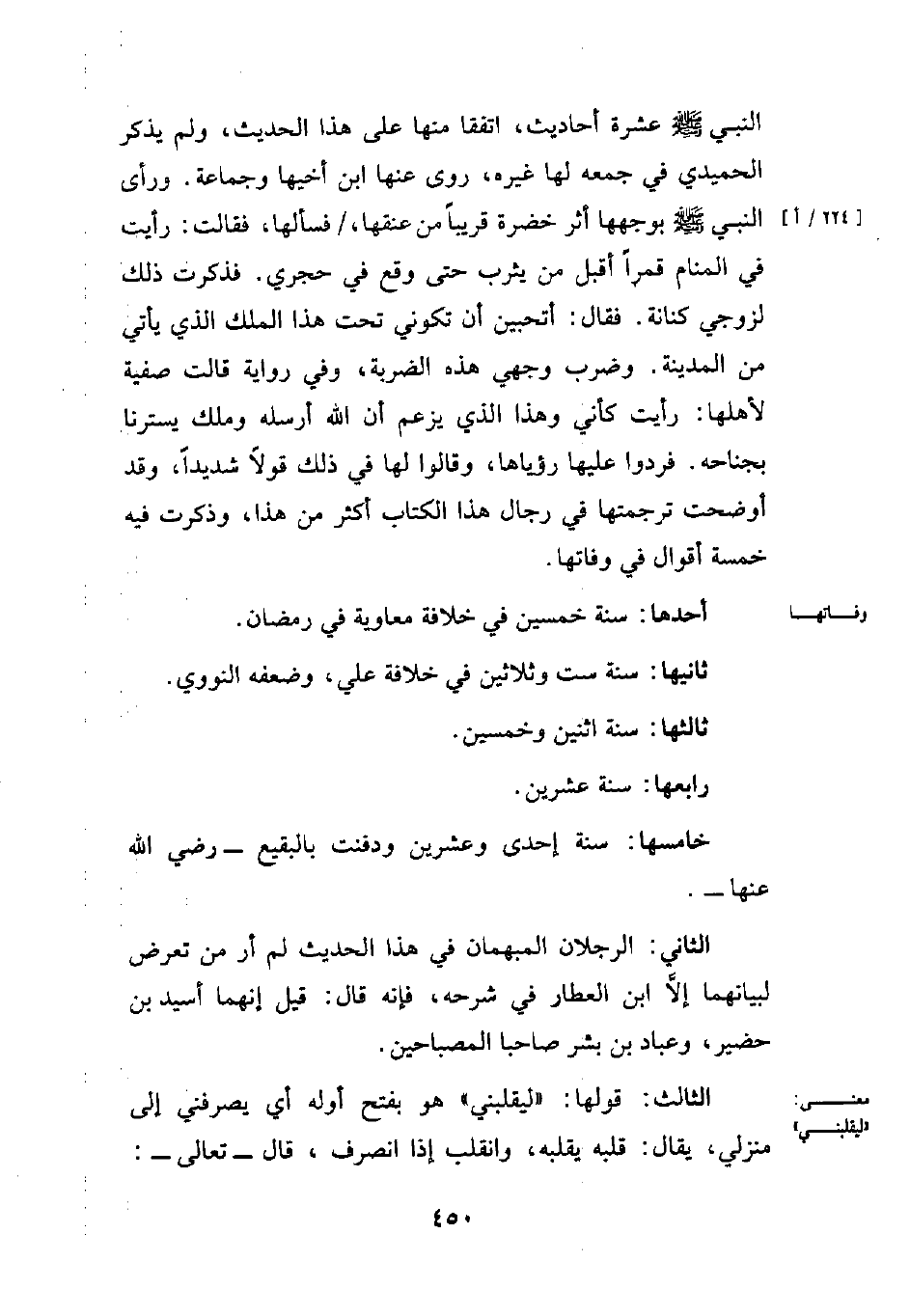 النبي - صلى الله عليه وسلم - عشرة أحاديث، اتفقا منها على هذا الحديث، ولم يذكر الحميدي في جمعه لها غيره، روى عنها ابن أخيها وجماعة. ورأى النبي - صلى الله عليه وسلم - بوجهها أثر خضرة قريباً من عنقها، فسألها، فقالت: رأيت في المنام قمراً أقبل من يثرب حتى وقع في حجري. فذكرت ذلك لزوجي كنانة. فقال: أتحبين أن تكوني تحت هذا الملك الذي يأتي من المدينة. وضرب وجهي هذه الضربة، وفي رواية قالت صفية لأهلها: رأيت كأني وهذا الذي يزعم أن الله أرسله وملك يسترنا بجناحه. فردوا عليها رؤياها، وقالوا لها في ذلك قولاً شديداً، وقد أوضحت ترجمتها في رجال هذا الكتاب أكثر من هذا، وذكرت فيه خمسة أقوال في وفاتها.