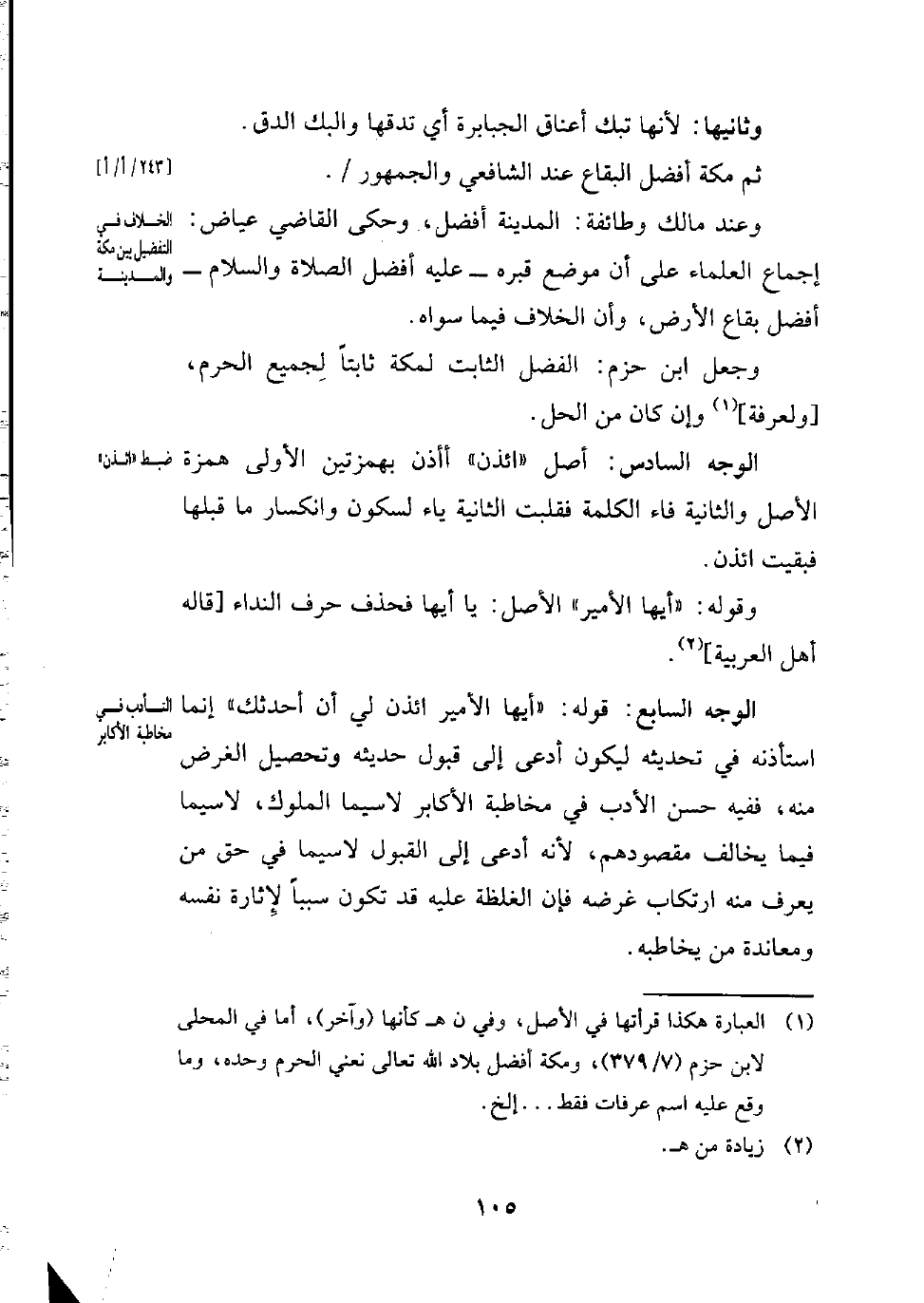 (¬1) العبارة هكذا قرأتها في الأصل وفي ن هـ كأنها (وآخر)، أما في المحلى لابن حزم (7/ 379)، ومكة أفضل بلاد الله تعالى نعني الحرم وحده، وما وقع عليه اسم عرفات فقط ... إلخ.