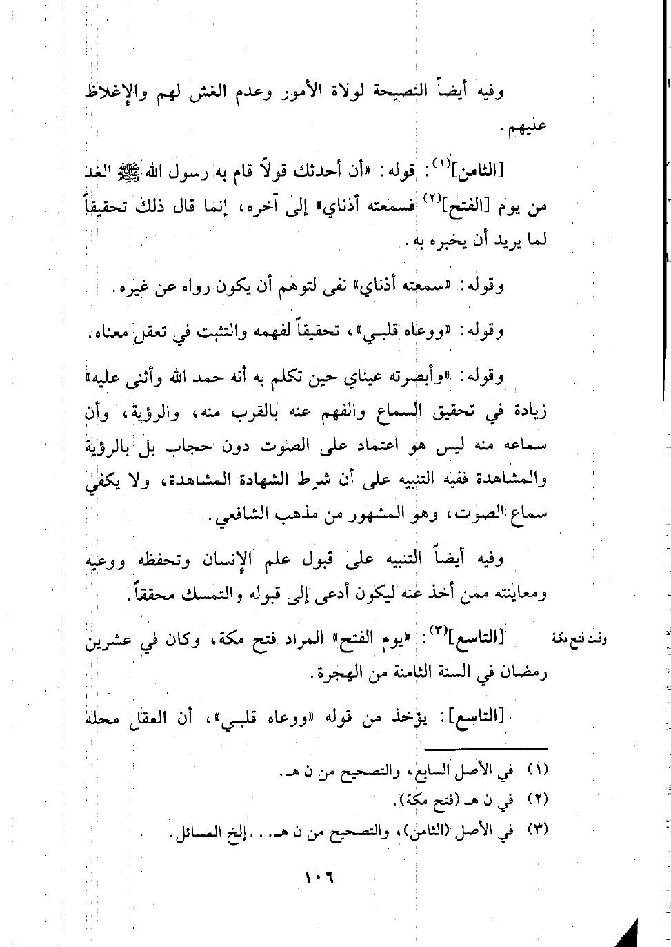 [الثامن] (¬1): قوله: "أن أحدثك قولاً قام به رسول الله - صلى الله عليه وسلم - الغد من يوم [الفتح] (¬2) فسمعته أذناي" إلى آخره، إنما قال ذلك تحقيقاً لما يريد أن يخبره به.