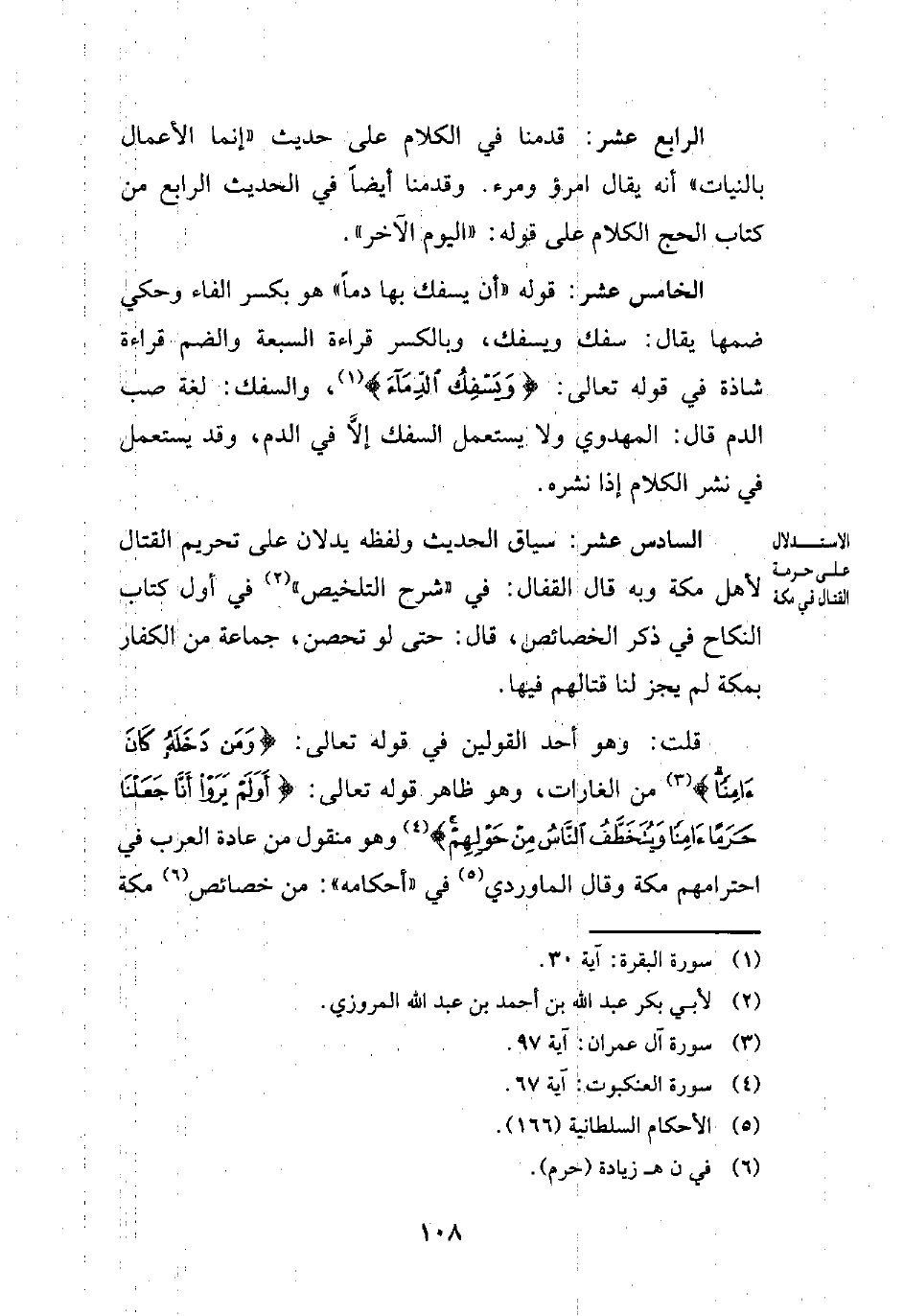 الخامس عشر: قوله "أن يسفك بها دماً" هو بكسر الفاء وحكي ضمها يقال: سفك ويسفك، وبالكسر قراءة السبعة والضم قراءة شاذة في قوله تعالى: {وَيَسْفِكُ الدِّمَاءَ} (¬1)، والسفك: لغة صب الدم قال: المهدوي ولا يستعمل السفك إلاَّ في الدم، وقد يستعمل في نشر الكلام إذا نشره.