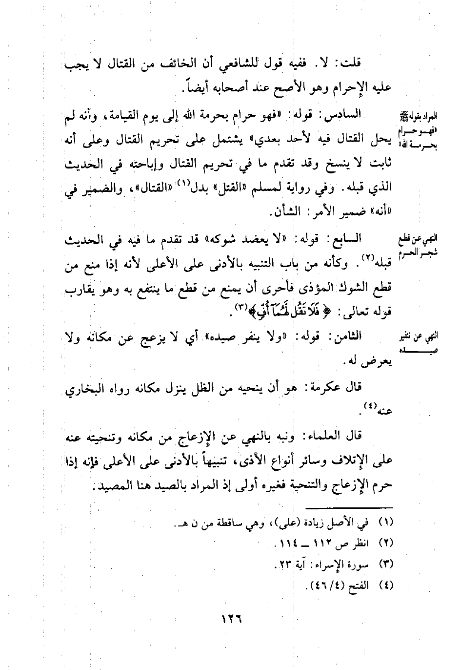 قال العلماء: ونبه بالنهي عن الإِزعاج من مكانه وتنحيته عنه على الإِتلاف وسائر أنواع الأذى، تنبيهاً بالأدنى على الأعلى فإِنه إذا حرم الإِزعاج والتنحية فغيره أولى إذ المراد بالصيد هنا المصيد.