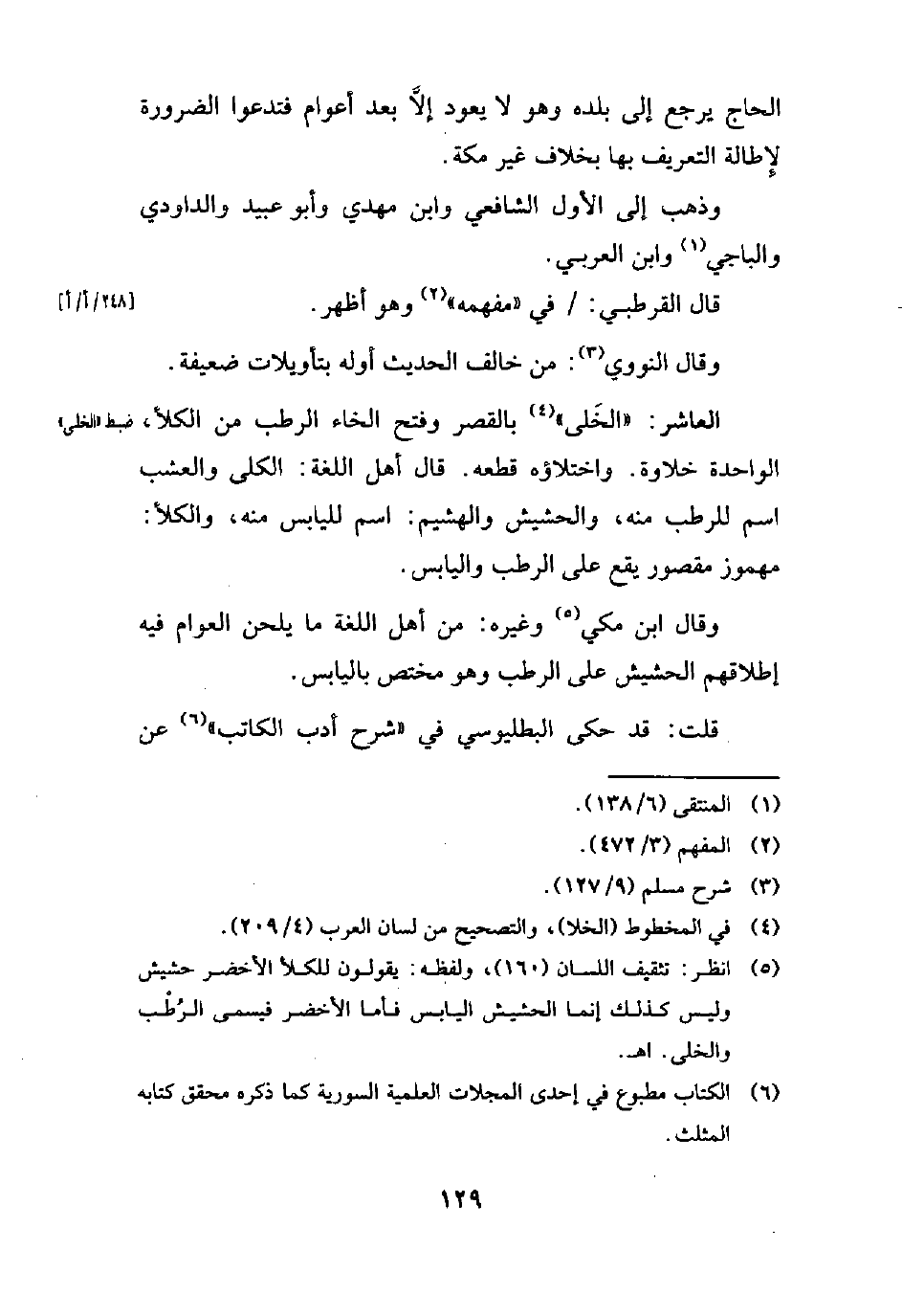 العاشر: "الخَلى" (¬4) بالقصر وفتح الخاء الرطب من الكلأ، الواحدة خلاوة. واختلاؤه قطعه. قال أهل اللغة: الكلى والعشب اسم للرطب منه، والحشيش والهشيم: اسم لليابس منه، والكلأ: مهموز مقصور يقع على الرطب واليابس.