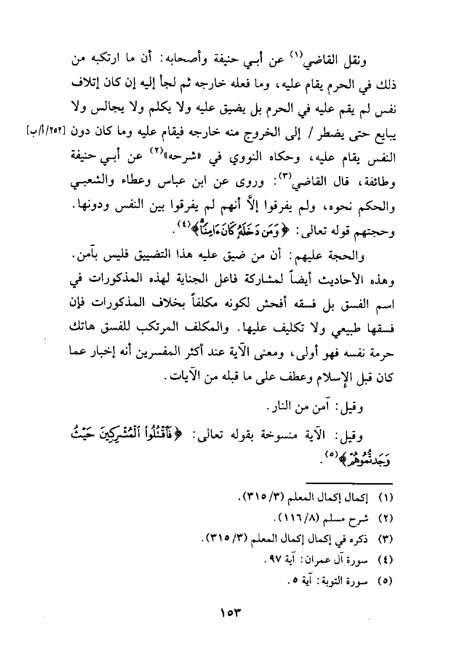 ونقل القاضي (¬1) عن أبي حنيفة وأصحابه: أن ما ارتكبه من ذلك في الحرم يقام عليه، وما فعله خارجه ثم لجأ إليه إن كان إتلاف نفس لم يقم عليه في الحرم بل يضيق عليه ولا يكلم ولا يجالس ولا يبايع حتى يضطر إلى الخروج منه خارجه فيقام عليه وما كان دون النفس يقام عليه، وحكاه النووي في "شرحه" (¬2) عن أبي حنيفة وطائفة، قال القاضي (¬3): وروى عن ابن عباس وعطاء والشعبي والحكم نحوه، ولم يفرقوا إلاَّ أنهم لم يفرقوا بين النفس ودونها. وحجتهم قوله تعالى: {وَمَنْ دَخَلَهُ كَانَ آمِنًا} (¬4).