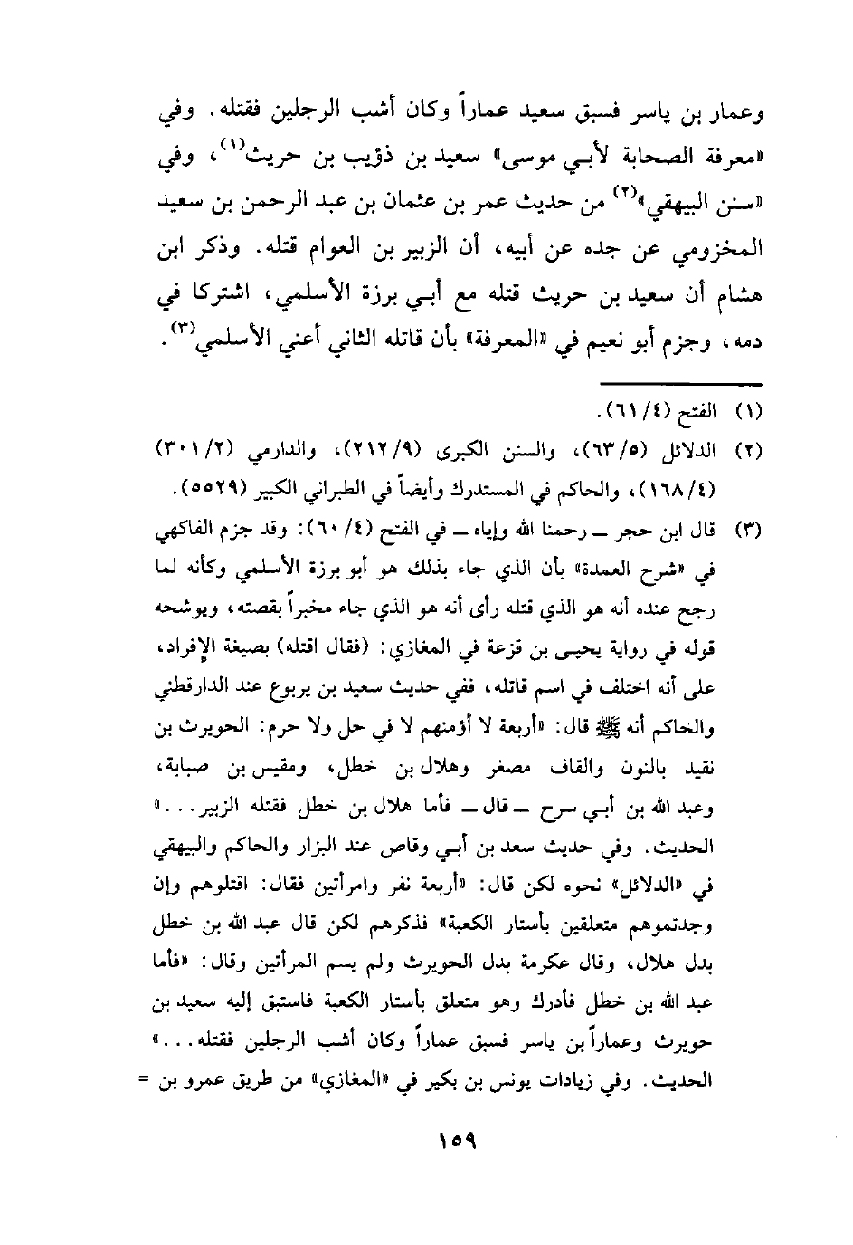 (¬3) قال ابن حجر -رحمنا الله وإياه- في الفتح (4/ 60): وقد جزم الفاكهي في "شرح العمدة" بأن الذي جاء بذلك هو أبو برزة الأسلمي وكأنه لما رجح عنده أنه هو الذي قتله رأى أنه هو الذي جاء مخبراً بقصته، ويوشحه قوله في رواية يحيى بن قزعة في المغازي: (فقال اقتله) بصيغة الإِفراد، على أنه اختلف في اسم قاتله، ففي حديث سعيد بن يربوع عند الدارقطني والحاكم أنه - صلى الله عليه وسلم - قال: "أربعة لا أؤمنهم لا في حل ولا حرم: الحويرث بن نقيد بالنون والقاف مصغر وهلال بن خطل، ومقيس بن صبابة، وعبد الله بن أبي سرح -قال- فأما هلال بن خطل فقتله الزبير ... " الحديث. وفي حديث سعد بن أبي وقاص عند البزار والحاكم والبيهقي في "الدلائل" نحوه لكن قال: "أربعة نفر وامرأتين فقال: اقتلوهم وإن وجدتموهم متعلقين بأستار الكعبة" فذكرهم لكن قال عبد الله بن خطل بدل هلال، وقال عكرمة بدل الحويرث ولم يسم المرأتين وقال: "فأما عبد الله بن خطل فأدرك وهو متعلق بأستار الكعبة فاستبق إليه سعيد بن حويرث وعماراً بن ياسر فسبق عماراً وكان أشب الرجلين فقتله ... " الحديث. وفي زيادات يونس بن بكير في "المغازي" من طريق عمرو بن =