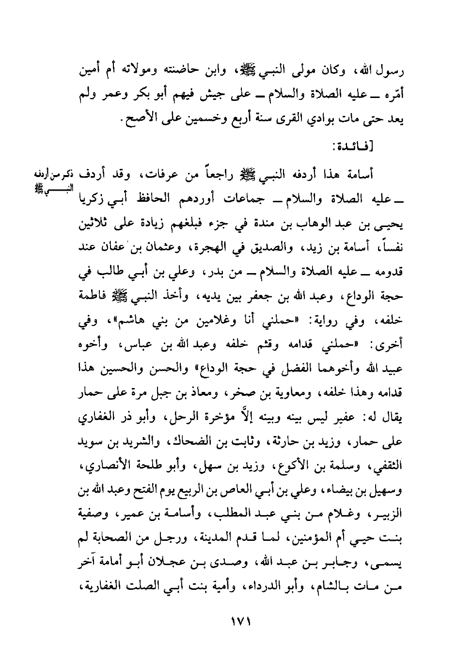 أسامة هذا أردفه النبي - صلى الله عليه وسلم - راجعاً من عرفات، وقد أردف -عليه الصلاة والسلام- جماعات أوردهم الحافظ أبي زكريا يحيى بن عبد الوهاب بن مندة في جزء فبلغهم زيادة على ثلاثين نفساً، أسامة بن زيد، والصديق في الهجرة، وعثمان بن عفان عند قدومه -عليه الصلاة والسلام- من بدر، وعلي بن أبي طالب في حجة الوداع، وعبد الله بن جعفر بين يديه، وأخذ النبي - صلى الله عليه وسلم - فاطمة خلفه، وفي رواية: "حملني أنا وغلامين من بني هاشم"، وفي أخرى: "حملني قدامه وقثم خلفه وعبد الله بن عباس، وأخوه عبيد الله وأخوهما الفضل في حجة الوداع" والحسن والحسين هذا قدامه وهذا خلفه، ومعاوية بن صخر، ومعاذ بن جبل مرة على حمار يقال له: عفير ليس بينه وبينه إلاَّ مؤخرة الرحل، وأبو ذر الغفاري على حمار، وزيد بن حارثة، وثابت بن الضحاك، والشريد بن سويد الثقفي، وسلمة بن الأكوع، وزيد بن سهل، وأبو طلحة الأنصاري، وسهيل بن بيضاء، وعلي بن أبي العاص بن الربيع يوم الفتح وعبد الله بن الزبير، وغلام من بني عبد المطلب، وأسامة بن عمير، وصفية بنت حيي أم المؤمنين، لما قدم المدينة، ورجل من الصحابة لم يسمى، وجابر بن عبد الله، وصدى بن عجلان أبو أمامة آخر من مات بالشام، وأبو الدرداء، وأمية بنت أبي الصلت الغفارية،