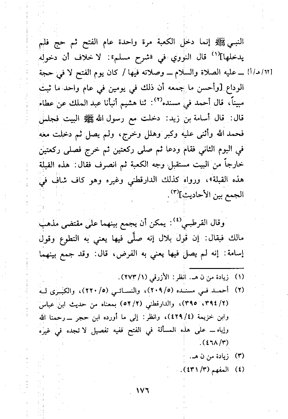 النبي - صلى الله عليه وسلم - إنما دخل الكعبة مرة واحدة عام الفتح ثم حج فلم يدخلها] (¬1) قال النووي في "شرح مسلم": لا خلاف أن دخوله -عليه الصلاة والسلام- وصلاته فيها كان يوم الفتح لا في حجة الوداع [وأحسن ما جمعه أن ذلك في يومين في عام واحد ما ثبت مبيناً، قال أحمد في مسنده (¬2): ثنا هشيم أنبأنا عبد الملك عن عطاء قال: قال أسامة بن زيد: دخلت مع رسول الله - صلى الله عليه وسلم - البيت فجلس فحمد الله وأثنى عليه وكبر وهلل وخرج، ولم يصل ثم دخلت معه في اليوم الثاني فقام ودعا ثم صلى ركعتين ثم خرج فصلى ركعتين خارجاً من البيت مستقبل وجه الكعبة ثم انصرف فقال: هذه القبلة هذه القبلة"، ورواه كذلك الدارقطني وغيره وهو كاف شاف في الجمع بين الأحاديث] (¬3).