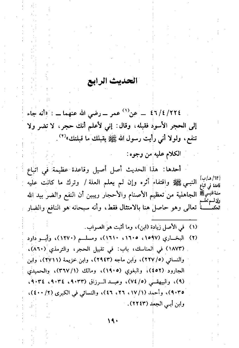 224/ 4/ 46 - عن (¬1) عمر -رضي الله عنهما-: "أنه جاء إلى الحجر الأسود فقبله، وقال: إني لأعلم أنك حجر، لا تضر ولا تنفع، ولولا أني رأيت رسول الله - صلى الله عليه وسلم - يقبلك ما قبلتك" (¬2).