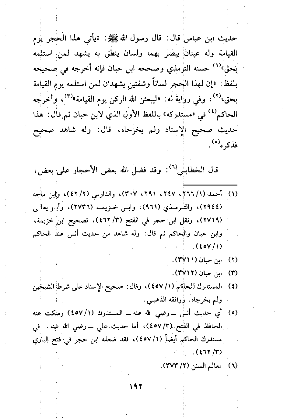 حديث ابن عباس قال: قال رسول الله - صلى الله عليه وسلم -: "يأتي هذا الحجر يوم القيامة وله عينان يبصر بهما ولسان ينطق به يشهد لمن استلمه بحق" (¬1) حسنه الترمذي وصححه ابن حبان فإنه أخرجه في صحيحه بلفظ: "إن لهذا الحجر لساناً وشفتين يشهدان لمن استلمه يوم القيامة بحق" (¬2)، وفي رواية له: "ليبعثن الله الركن يوم القيامة" (¬3)، وأخرجه الحاكم (¬4) في "مستدركه" باللفظ الأول الذي لابن حبان ثم قال: هذا حديث صحيح الإِسناد ولم يخرجاه، قال: وله شاهد صحيح فذكره (¬5).