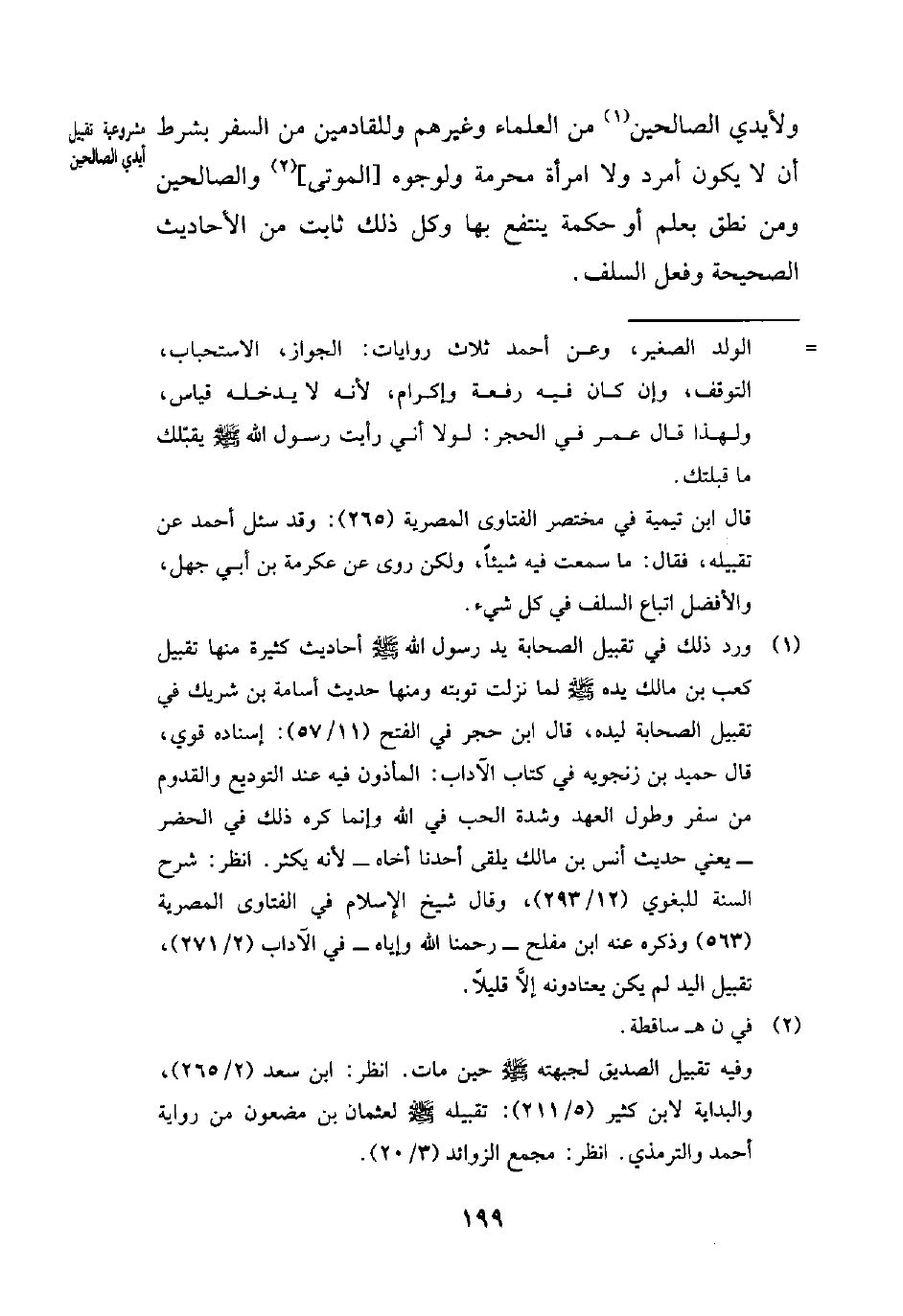 (¬1) ورد ذلك في تقبيل الصحابة يد رسول الله - صلى الله عليه وسلم - أحاديث كثيرة منها تقبيل كعب بن مالك يده - صلى الله عليه وسلم - لما نزلت توبته ومنها حديث أسامة بن شريك في تقبيل الصحابة ليده، قال ابن حجر في الفتح (11/ 57): إسناده قوي، قال حميد بن زنجويه في كتاب الآداب: المأذون فيه عند التوديع والقدوم من سفر وطول العهد وشدة الحب في الله وإنما كره ذلك في الحضر -يعني حديث أنس بن مالك يلقى أحدنا أخاه- لأنه يكثر. انظر: شرح السنة للبغوي (12/ 293)، وقال شيخ الإِسلام في الفتاوى المصرية (563) وذكره عنه ابن مفلح -رحمنا الله وإياه- في الآداب (2/ 271)، تقبيل اليد لم يكن يعتادونه إلاَّ قليلاً.