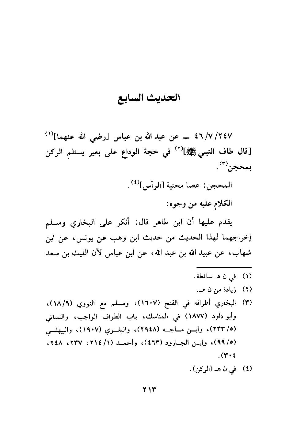 247/ 7/ 46 - عن عبد الله بن عباس [رضي الله عنهما] (¬1) [قال طاف النبي - صلى الله عليه وسلم -، (¬2) في حجة الوداع على بعير يستلم الركن بمحجن (¬3).