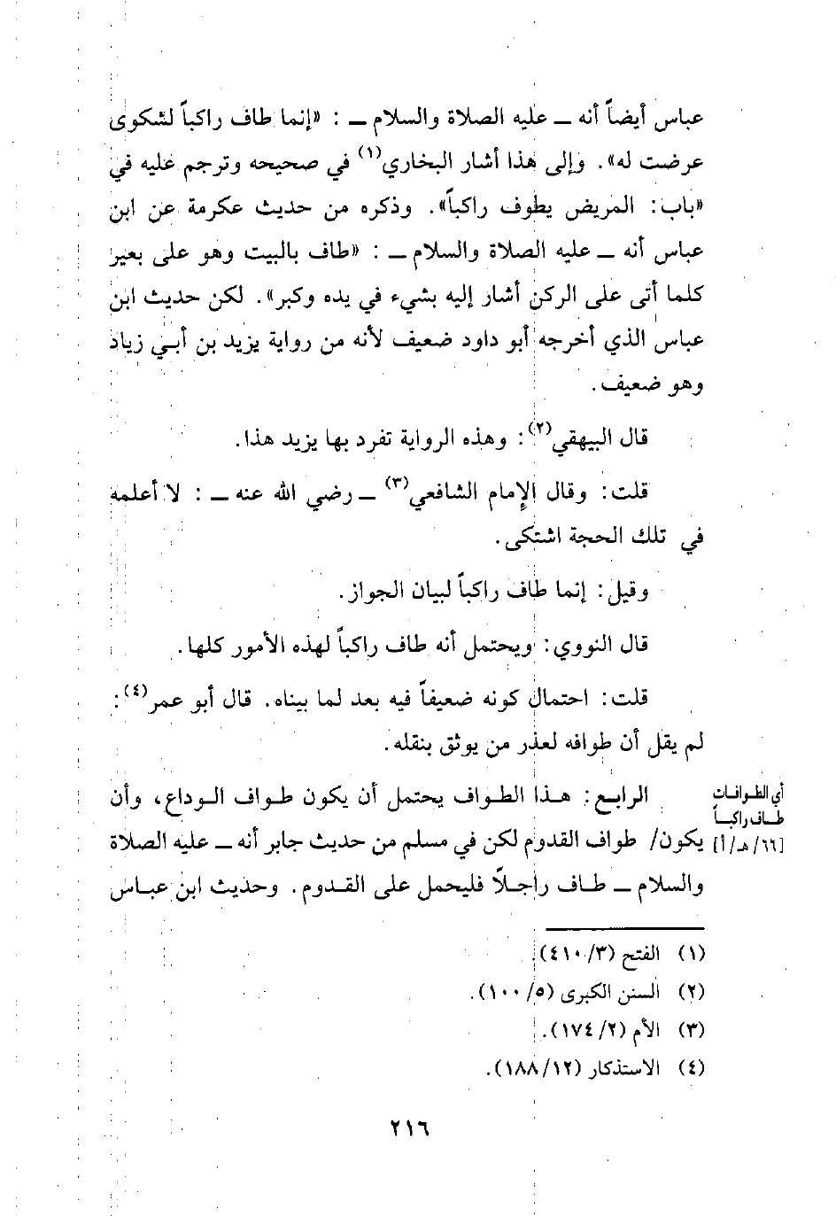 الرابع: هذا الطواف يحتمل أن يكون طواف الوداع، وأن يكون طواف القدوم لكن في مسلم من حديث جابر أنه -عليه الصلاة والسلام- طاف راجلاً فليحمل على القدوم. وحديث ابن عباس