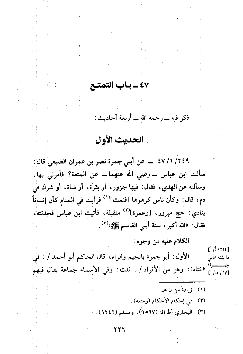 249/ 1/ 47 - عن أبي جمرة نصر بن عمران الضبعي قال: سألت ابن عباس -رضي الله عنهما- عن المتعة؟ فأمرني بها. وسألته عن الهدي، فقال: فيها جزور، أو بقرة، أو شاة، أو شرك في دم, قال: وكأن ناس كرهوها [فنمت] (¬1) فرأيت في المنام كأن إنساناً ينادي: حج مبرور، [وعمرة] (¬2) متقبلة، فأتيت ابن عباس فحدثته، فقال: "الله أكبر، سنة أبي القاسم - صلى الله عليه وسلم -" (¬3).