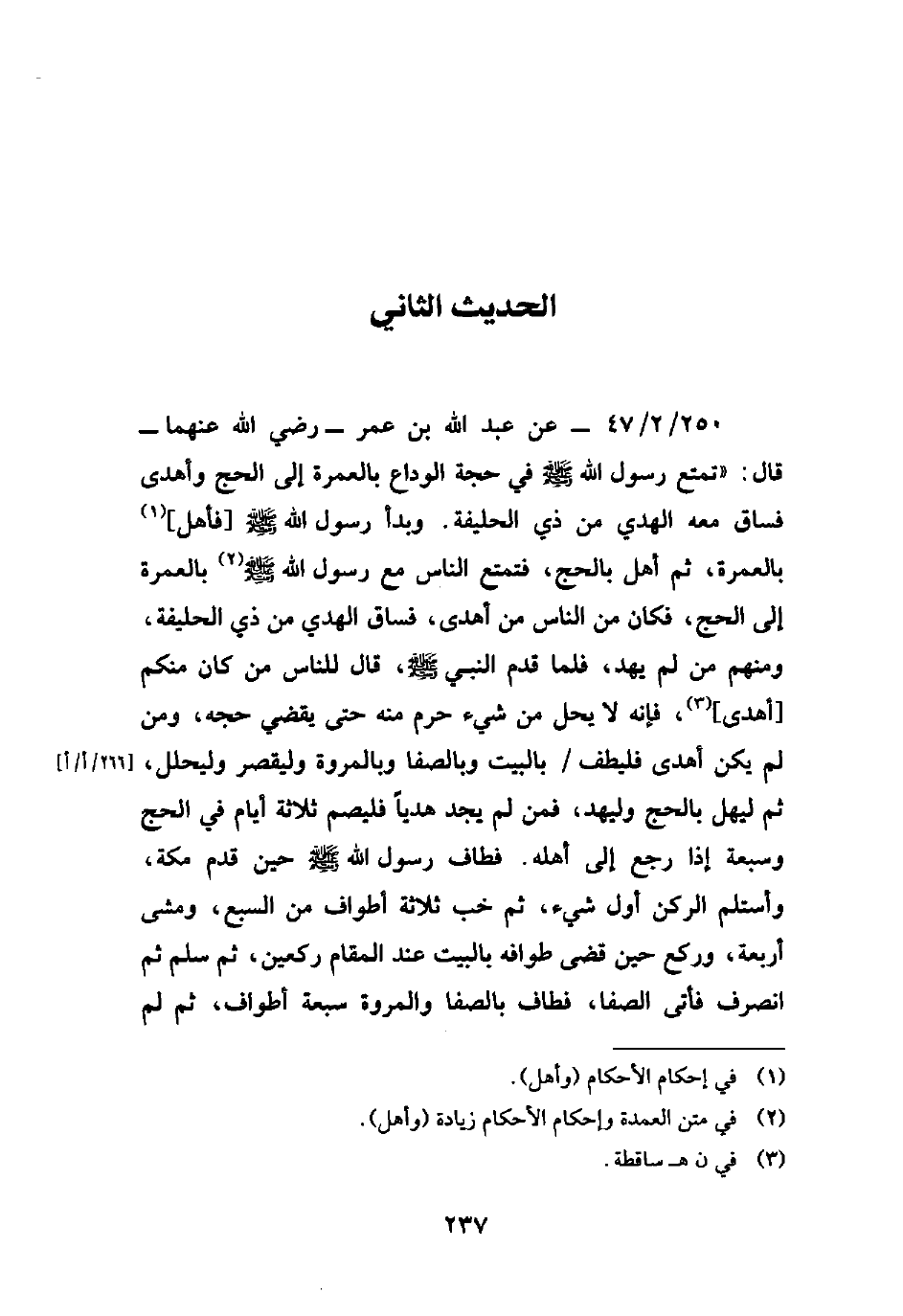 250/ 2/ 47 - عن عبد الله بن عمر -رضي الله عنهما- قال: "تمتع رسول الله - صلى الله عليه وسلم - في حجة الوداع بالعمرة إلى الحج وأهدى فساق معه الهدي من ذي الحليفة. وبدأ رسول الله - صلى الله عليه وسلم -[فأهل] (¬1) بالعمرة، ثم أهل بالحج، فتمتع الناس مع رسول الله - صلى الله عليه وسلم - (¬2) بالعمرة إلى الحج، فكان من الناس من أهدى، فساق الهدي من ذي الحليفة، ومنهم من لم يهد، فلما قدم النبي - صلى الله عليه وسلم -، قال للناس من كان منكم [أهدى] (¬3)، فإنه لا يحل من شيء حرم منه حتى يقضي حجه، ومن لم يكن أهدى فليطف بالبيت وبالصفا وبالمروة وليقصر وليحلل، ثم ليهل بالحج وليهد، فمن لم يجد هدياً فليصم ثلاثة أيام في الحج وسبعة إذا رجع إلى أهله. فطاف رسول الله - صلى الله عليه وسلم - حين قدم مكة، وأستلم الركن أول شيء، ثم خب ثلاثة أطوات من السبع، ومشى أربعة، وركع حين قضى طوافه بالبيت عند المقام ركعين، ثم سلم ثم انصرف فأتى الصفا، فطاف بالصفا والمروة سبعة أطواف، ثم لم
