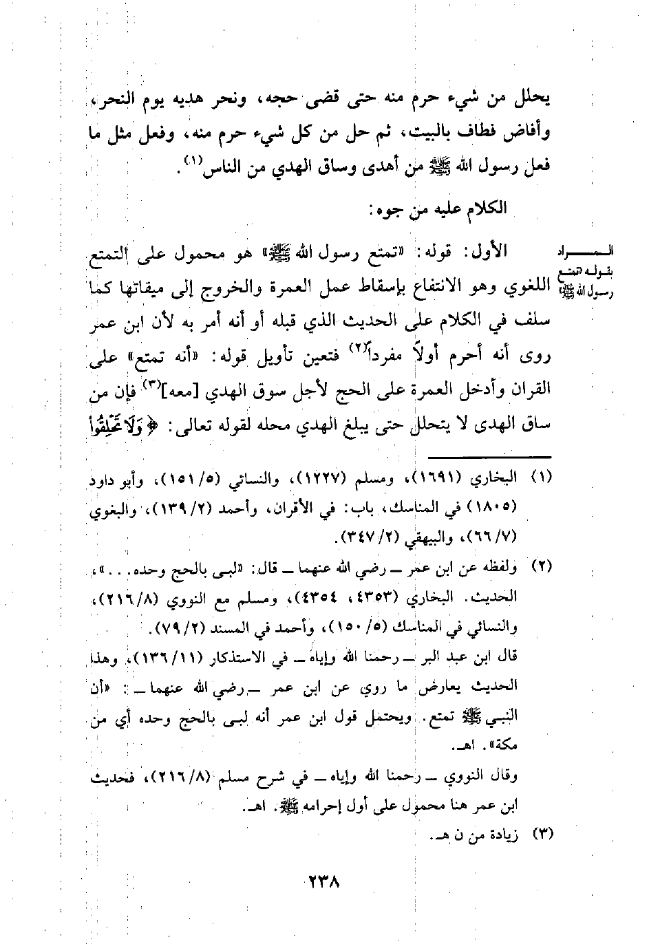 (¬2) ولفظه عن ابن عمر -رضي الله عنهما- قال: "لبى بالحج وحده ... "، الحديث. البخاري (4353، 4354)، ومسلم مع النووي (8/ 216)، والنسائي في المناسك (5/ 150)، وأحمد في المسند (2/ 79).