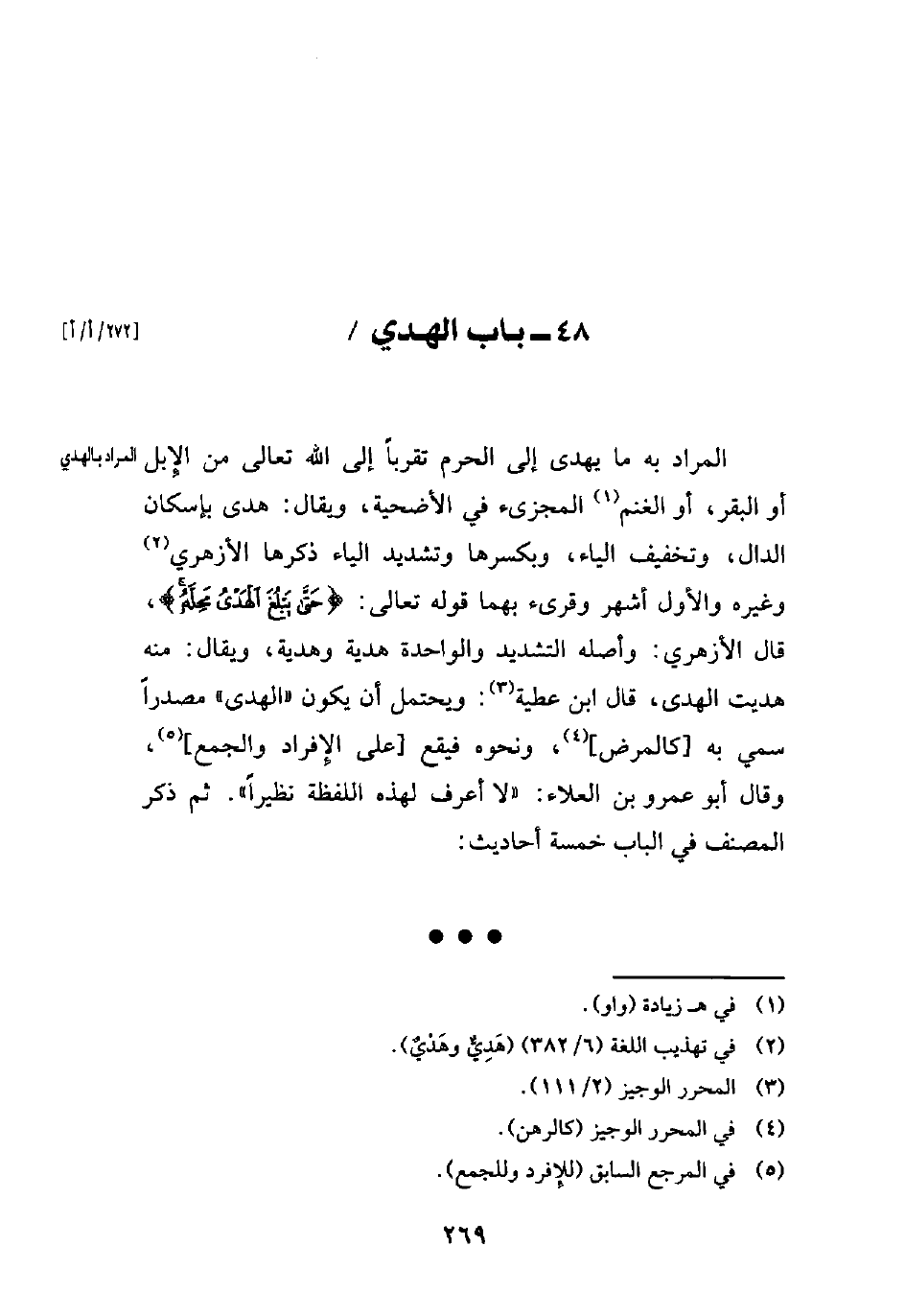 المراد به ما يهدى إلى الحرم تقرباً إلى الله تعالى من الإِبل أو البقر، أو الغنم (¬1) المجزىء في الأضحية، ويقال: هدى بإسكان الدال، وتخفيف الياء، وبكسرها وتشديد الياء ذكرها الأزهري (¬2) وغيره والأول أشهر وقرىء بهما قوله تعالى: {حَتَّى يَبْلُغَ الْهَدْيُ مَحِلَّهُ}، قال الأزهري: وأصله التشديد والواحدة هدية وهدية، ويقال: منه هديت الهدى، قال ابن عطية (¬3): ويحتمل أن يكون "الهدى" مصدراً سمي به [كالمرض] (¬4)، ونحوه فيقع [على الإِفراد والجمع] (¬5)، وقال أبو عمرو بن العلاء: "لا أعرف لهذه اللفظة نظيراً". ثم ذكر المصنف في الباب خمسة أحاديث: