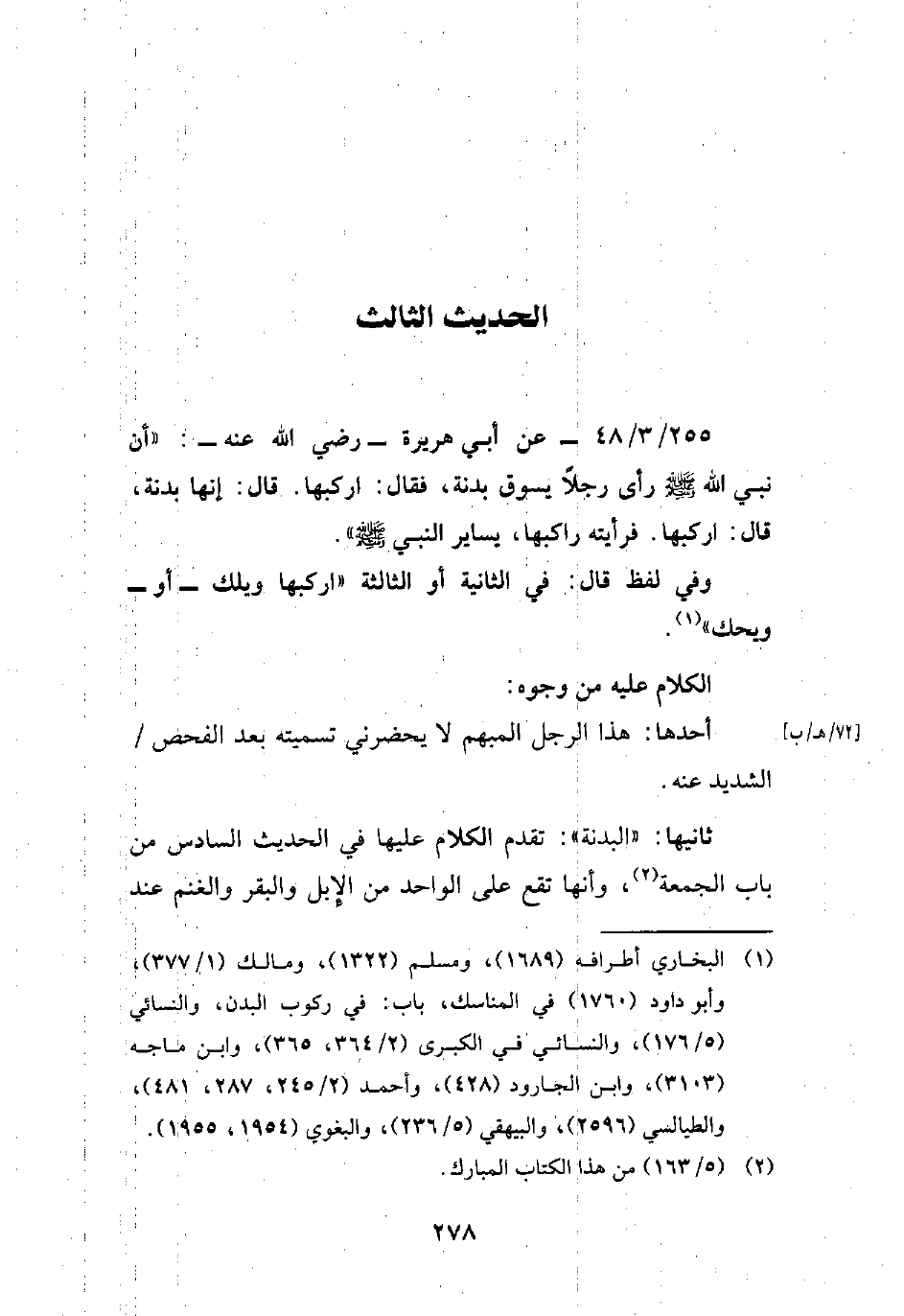 255/ 3/ 48 - عن أبي هريرة -رضي الله عنه-: "أن نبي الله - صلى الله عليه وسلم - رأى رجلاً يسوق بدنة، فقال: اركبها، قال: إنها بدنة، قال: اركبها. فرأيته راكبها، يساير النبي - صلى الله عليه وسلم -".