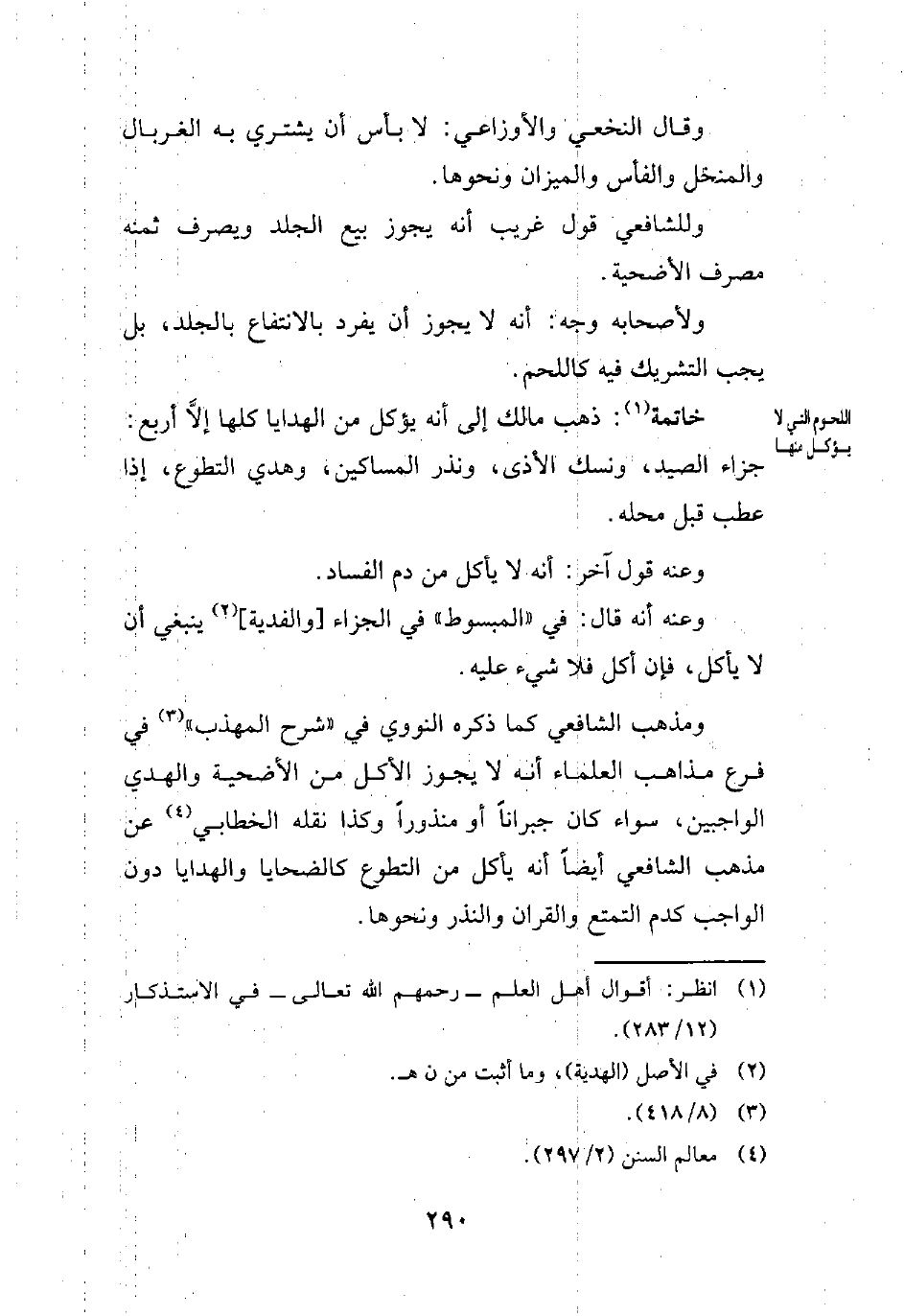 خاتمة (¬1): ذهب مالك إلى أنه يؤكل من الهدايا كلها إلاَّ أربع: جزاء الصيد، ونسك الأذى، ونذر المساكين، وهدي التطوع، إذا عطب قبل محله.