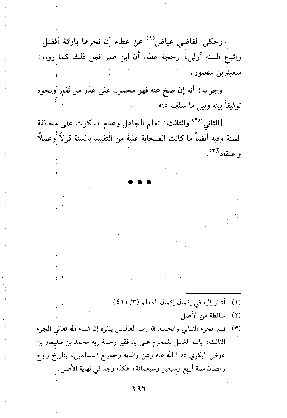 (¬3) تم الجزء الثاني والحمد لله رب العالمين يتلوه إن شاء الله تعالى الجرء الثالث، باب الغسل للمحرم على يد فقير رحمة ربه محمد بن سليمان بن عوض البكري عفا الله عنه وعن والديه وجميع المسلمين، بتاريخ رابع رمضان سنة أربع وسبعين وسبعمائة، هكذا وجد في نهاية الأصل.