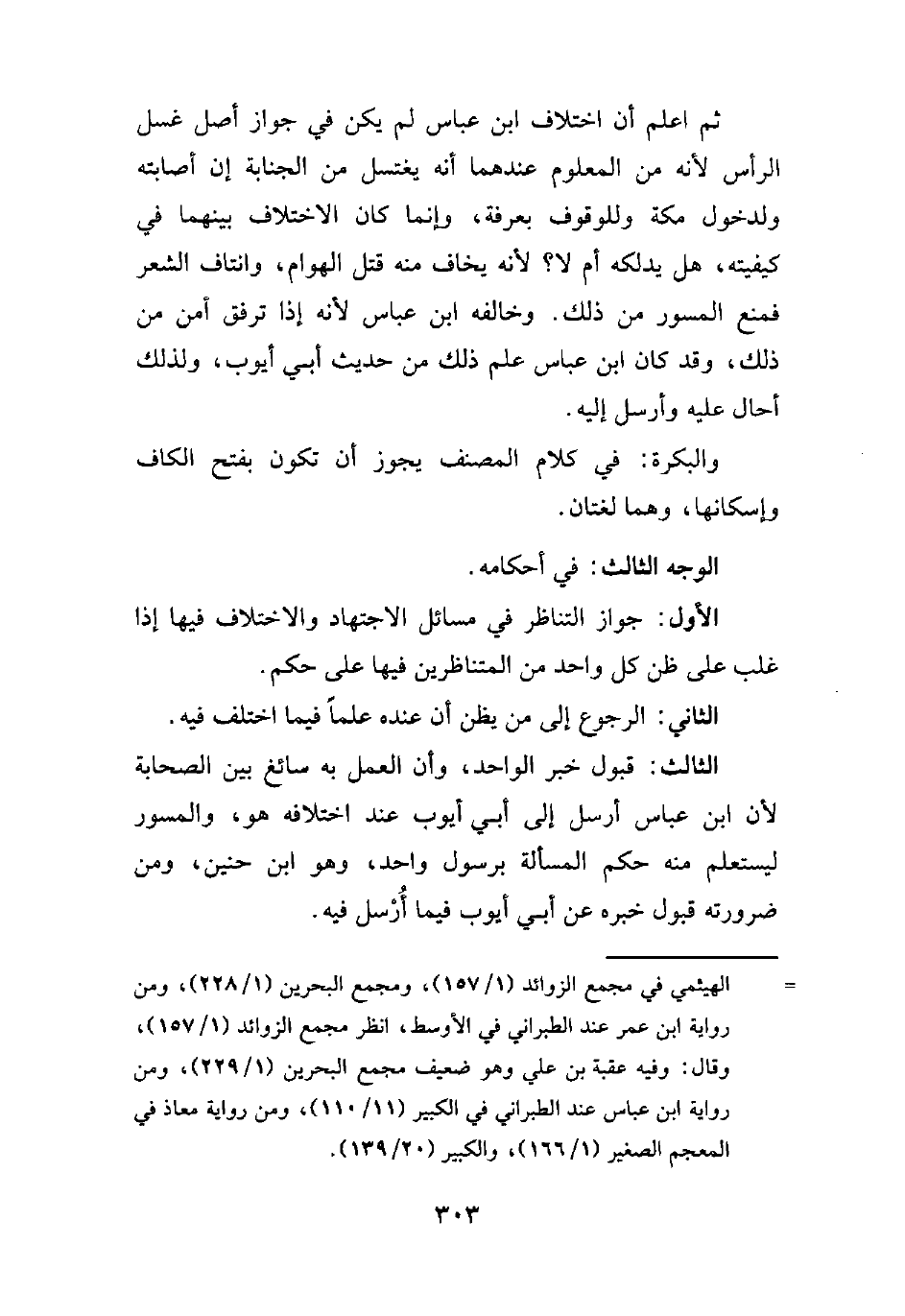 الثالث: قبول خبر الواحد، وأن العمل به سائغ بين الصحابة لأن ابن عباس أرسل إلى أبي أيوب عند اختلافه هو، والمسور ليستعلم منه حكم المسألة برسول واحد، وهو ابن حنين، ومن ضرورته قبول خبره عن أبي أيوب فيما أُرْسل فيه.
