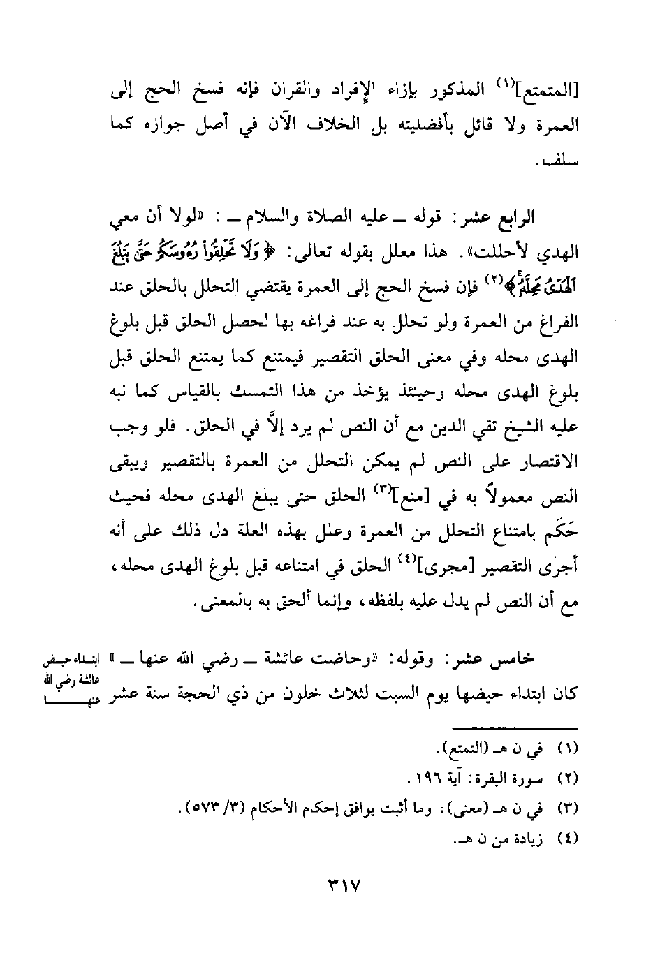 الرابع عشر: قوله -عليه الصلاة والسلام-: "لولا أن معي الهدي لأحللت". هذا معلل بقوله تعالى: {وَلَا تَحْلِقُوا رُءُوسَكُمْ حَتَّى يَبْلُغَ الْهَدْيُ مَحِلَّهُ} (¬2) فإن فسخ الحج إلى العمرة يقتضي التحلل بالحلق عند الفراغ من العمرة ولو تحلل به عند فراغه بها لحصل الحلق قبل بلوغ الهدى محله وفي معنى الحلق التقصير فيمتنع كما يمتنع الحلق قبل بلوغ الهدى محله وحينئذ يؤخذ من هذا التمسك بالقياس كما نبه عليه الشيخ تقي الدين مع أن النص لم يرد إلاَّ في الحلق. فلو وجب الاقتصار على النص لم يمكن التحلل من العمرة بالتقصير ويبقى النص معمولاً به في [منع] (¬3) الحلق حتى يبلغ الهدى محله فحيث حَكَم بامتناع التحلل من العمرة وعلل بهذه العلة دل ذلك على أنه أجرى التقصير [مجرى] (¬4) الحلق في امتناعه قبل بلوغ الهدى محله، مع أن النص لم يدل عليه بلفظه، وإنما ألحق به بالمعنى.