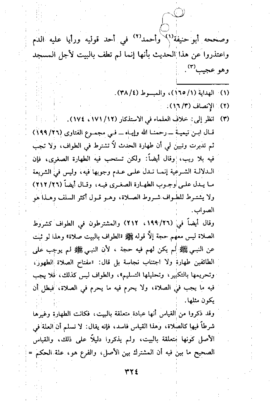 وقال أيضاً في (26/ 199، 212) والمشترطون في الطواف كشروط الصلاة ليس معهم حجة إلاَّ قوله - صلى الله عليه وسلم - "الطواف بالبيت صلاة" وهذا لو ثبت عن النبي - صلى الله عليه وسلم - لم يكن لهم فيه حجة، لأن النبي - صلى الله عليه وسلم - لم يوجب على الطائفين طهارة ولا اجتناب نجاسة بل قال: "مفتاح الصلاة الطهور، وتحريمها بالتكبير، وتحليلها التسليم"، والطواف ليس كذلك، فلا يجب فيه ما يجب في الصلاة، ولا يحرم فيه ما يحرم في الصلاة، فبطل أن يكون مثلها.