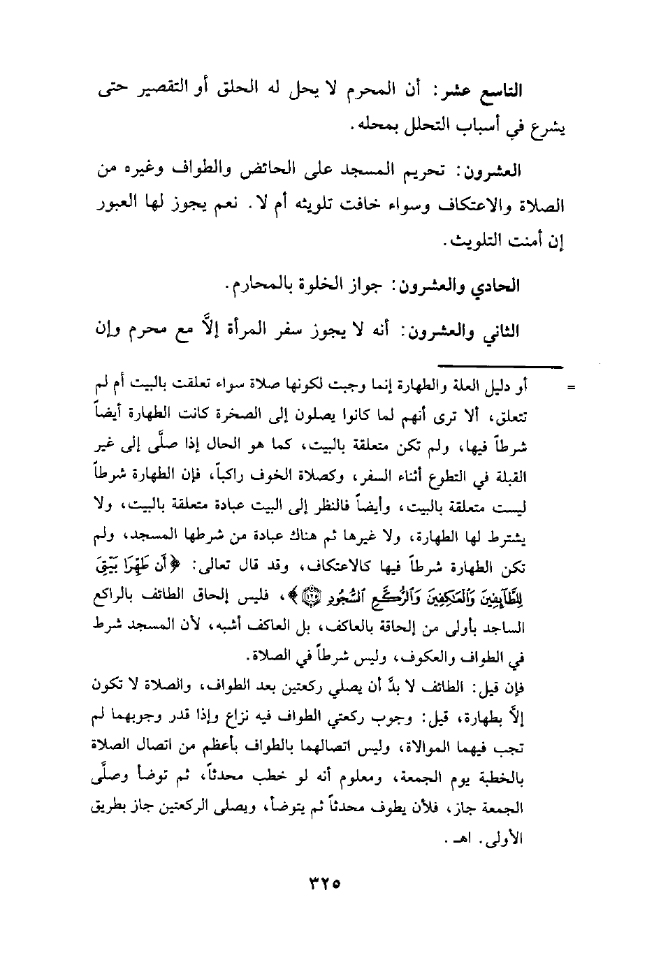العشرون: تحريم المسجد على الحائض والطواف وغيره من الصلاة والاعتكاف وسواء خافت تلويثه أم لا. نعم يجوز لها العبور إن أمنت التلويث.