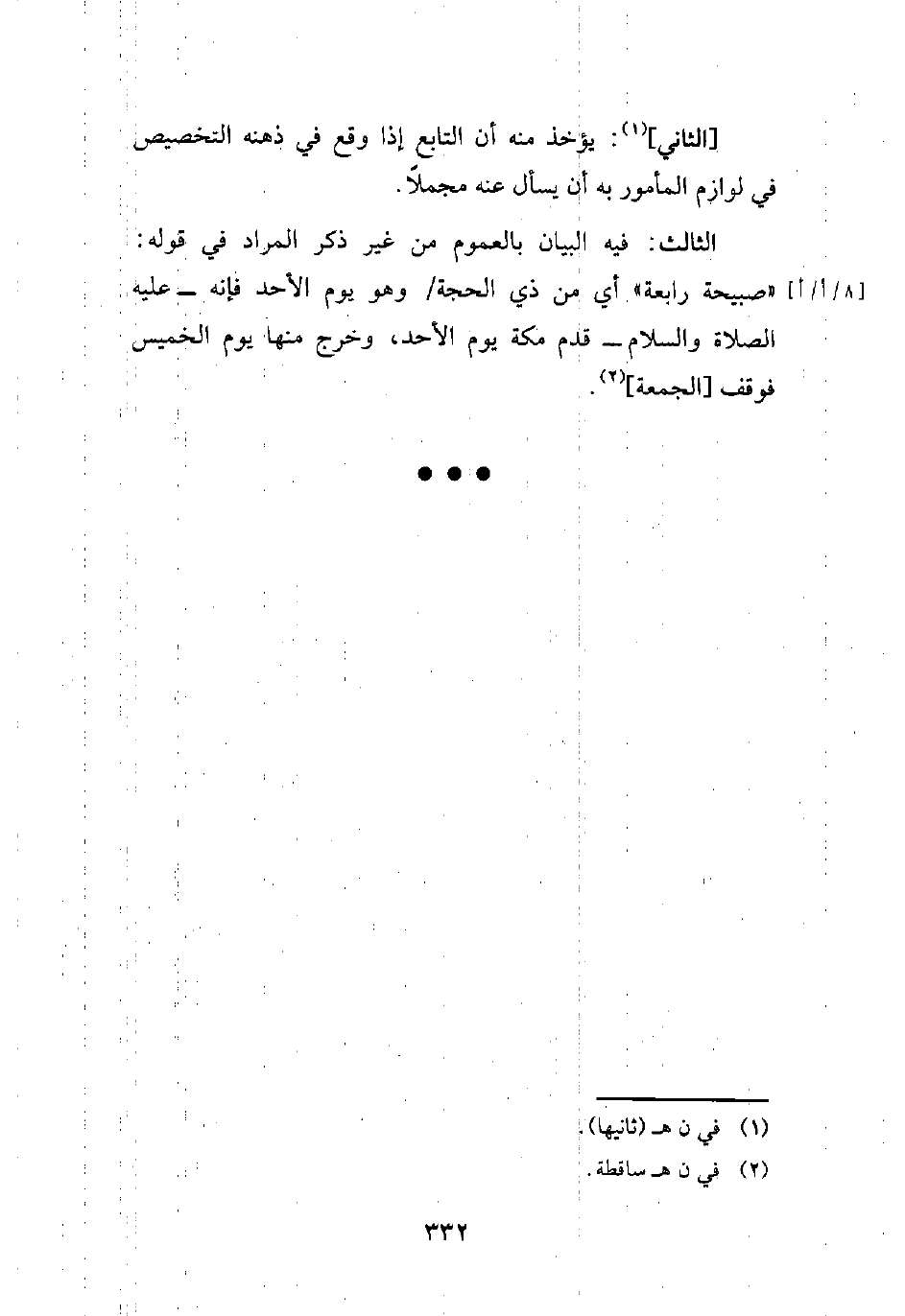 الثالث: فيه البيان بالعموم من غير ذكر المراد في قوله: "صبيحة رابعة" أي من ذي الحجة وهو يوم الأحد فإنه -عليه الصلاة والسلام- قدم مكة يوم الأحد، وخرج منها يوم الخميس فوقف [الجمعة] (¬2).