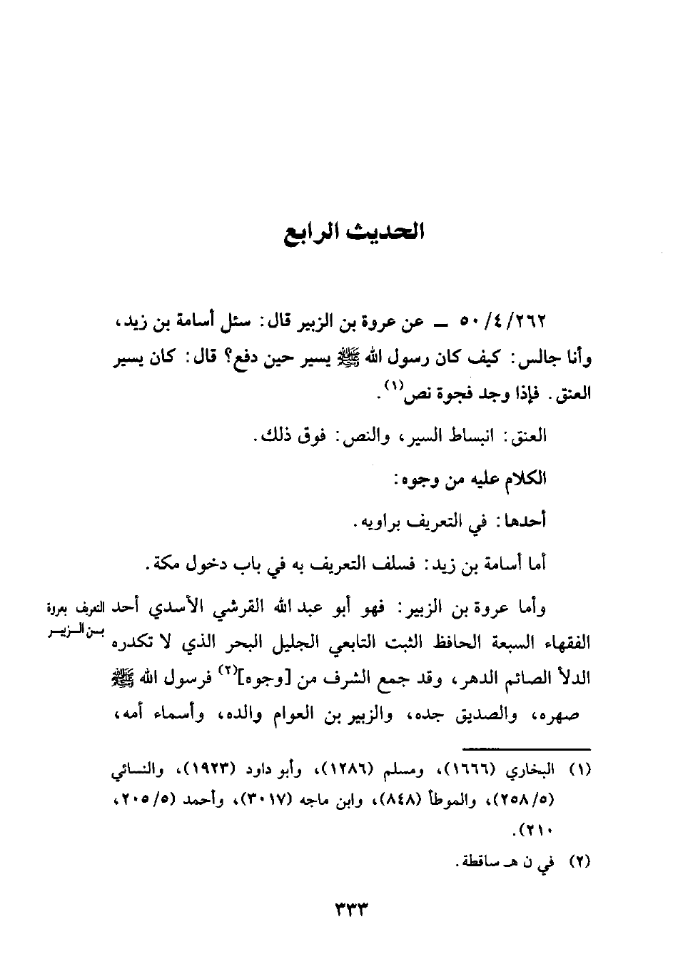 262/ 4/ 50 - عن عروة بن الزبير قال: سئل أسامة بن زيد، وأنا جالس: كيف كان رسول الله - صلى الله عليه وسلم - يسير حين دفع؟ قال: كان يسير العنق. فإذا وجد فجوة نص (¬1).