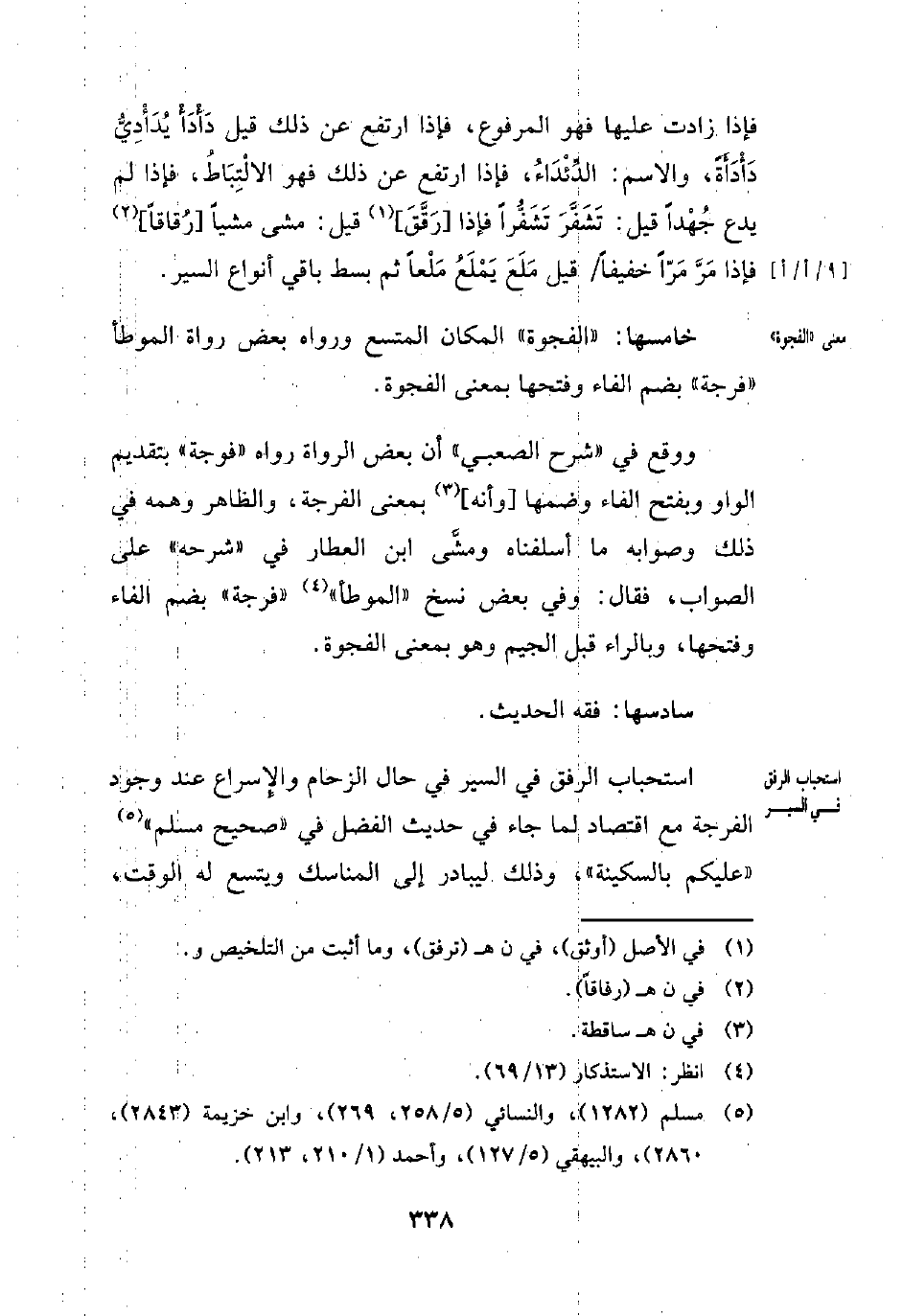 استحباب الرفق في السير في حال الزحام والإِسراع عند وجود الفرجة مع اقتصاد لما جاء في حديث الفضل في "صحيح مسلم" (¬5) "عليكم بالسكينة"، وذلك ليبادر إلى المناسك ويتسع له الوقت،