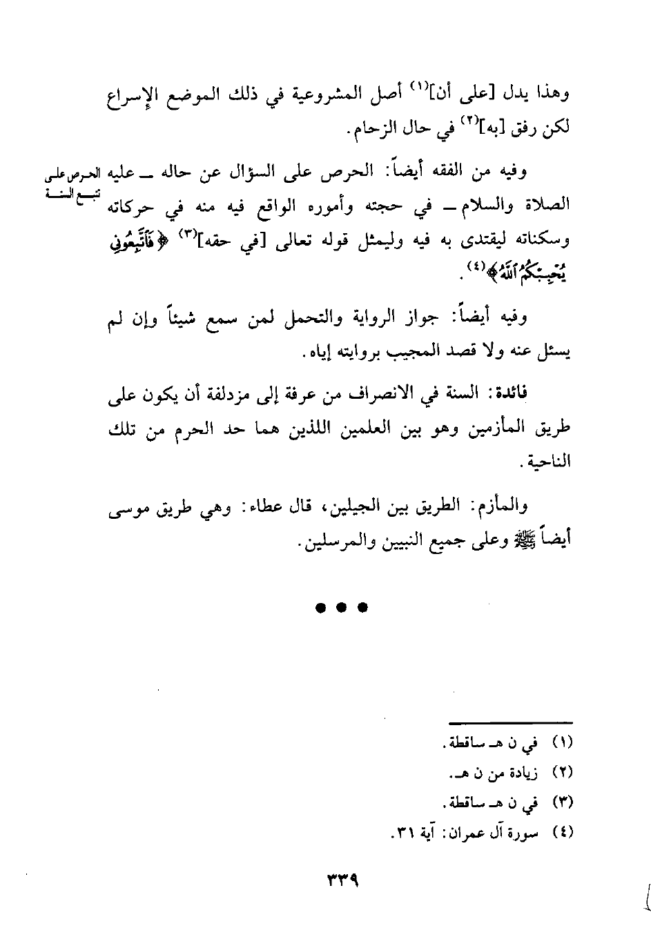 وفيه من الفقه أيضاً: الحرص على السؤال عن حاله -عليه الصلاة والسلام- في حجته وأموره الواقع فيه منه في حركاته وسكناته ليقتدى به فيه وليمثل قوله تعالى [في حقه] (¬3) {فَاتَّبِعُونِي يُحْبِبْكُمُ اللَّهُ} (¬4).