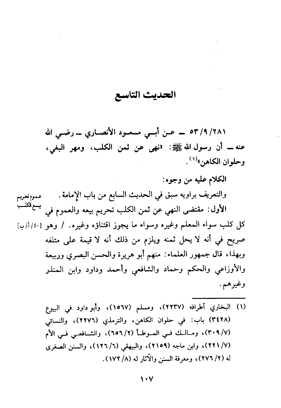 281/ 9/ 53 - عن أبي مسعود الأنصاري -رضي الله عنه- أن رسول الله - صلى الله عليه وسلم -: "نهى عن ثمن الكلب، ومهر البغي، وحلوان الكاهن" (¬1).
