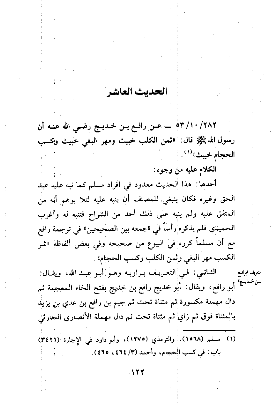 282/ 10/ 53 - عن رافع بن خديج -رضي الله عنه- أن رسول الله - صلى الله عليه وسلم - قال: "ثمن الكلب خبيث ومهر البغي خبيث وكسب الحجام خبيث" (¬1).