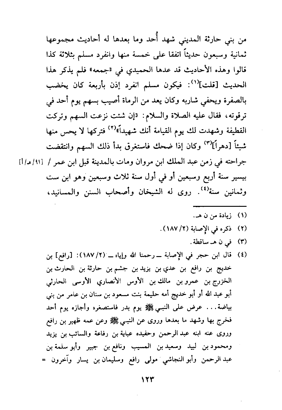 (¬4) قال ابن حجر في الإِصابة -رحمنا الله وإياه- (2/ 187): [رافع] بن خديج بن رافع بن عدي بن يزيد بن جشم بن حارثة بن الحارث بن الخزرج بن عمرو بن مالك بن الأوس الأنصاري الأوسى الحارثي أبو عبد الله أو أبو خديج أمه حليمة بنت مسعود بن سنان بن عامر من بني بياضة ... عرض على النبي - صلى الله عليه وسلم - يوم بدر فاستصغره وأجازه يوم أحد فخرج بها وشهد ما بعدها وروى عن النبي - صلى الله عليه وسلم - وعن عمه ظهير بن رافع وروى عنه ابنه عبد الرحمن وحفيده عباية بن رفاعة والسائب بن يزيد ومحمود بن لبيد وسعيد بن المسيب ونافع بن جبير وأبو سلمة بن عبد الرحمن وأبو النجاشي مولى رافع وسليمان بن يسار وآخرون =