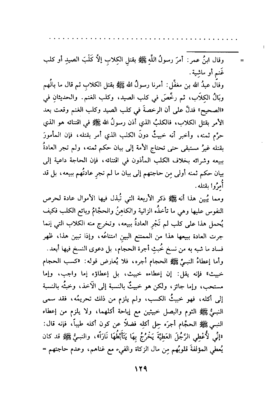 وقال عبدُ الله بن مغفَّل: أمرنا رسولُ الله - صلى الله عليه وسلم - بقتل الكلابِ ثم قال ما بالُهم وبَالُ الكِلاَب، ثم رخَّصَ في كلب الصيد، وكلب الغنم. والحديثانِ في "الصحيح" فدلَّ على أن الرخصةَ في كلب الصيد وكلب الغنم وقعت بعد الأمر بقتل الكلاب، فالكلبُ الذي أذن رسولُ الله - صلى الله عليه وسلم - في اقتنائه هو الذي حرَّم ثمنه، وأخبر أنه خبيثٌ دونَ الكلب الذي أمر بقتله، فإن المأمورَ بقتله غيرُ مستبقى حتى تحتاج الأمة إلى بيان حكم ثمنه، ولم تجر العادةُ ببيعه وشرائه بخلاف الكلب المأذون في اقتنائه، فإن الحاجة داعية إلى بيان حكم ثمنه أولى مِن حاجتهم إلى بيان ما لم تجرِ عادتُهم ببيعه، بل قد أُمِرُوا بقتله.